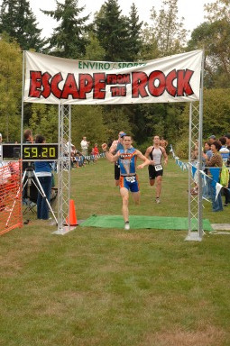 Comments: Mile 1 = 5:42 - 181 bpm Mile 2 = 5:43 - 184 bpm Last 0.5 = 2:10 - 189 bpm I think I had the fastest run of the day. Even though my legs were dying on the bike, that didn't carry over to the run and my legs felt fine. I have to remember that for next time. My strategy was to just pick people off, one by one, and that's what I did. I was in 10th place overall after a mile, and the 9th place guy was about 30 feet in front of me. It took me another full mile to catch him. It was an out-and-back course, and I noticed I had closed in on him on the hills at the beginning. But the middle mile was flat and he was able to hold me off there. So, I decided to surge when we got back to the hills to get by him. The strategy worked, and once I was past him other people were in sight and I decided I could catch them. So, with about 1/2 mile to go, I started my kick (I did that last 1/2 mile in 4:20/mile pace). I passed some jerk that cut the course to try to hold me off, then I passed another guy, and another guy, and one more guy with 200 yards to go. So between 1/2 mile and 200 yards from the finish, I moved from 10th place to 5th. 100 yards from the finish I looked over my shoulder, and everyone I passed had gathered into a big pack right behind me. The finish was an all-out group sprint, and I'll admit I was running scared, but I held my ground and finished up front. Here's how close the finish was. #5 59:19.3 - Me #6 59:19.8 #7 59:20.2 - 2nd person in my age group #8 59:20.6 #9 59.27.6 - 3rd person in my age group I decided I owe my victory to my slickness in taking off my wetsuit in T1 :) What would you do differently?: Nothing. ![]() Post race