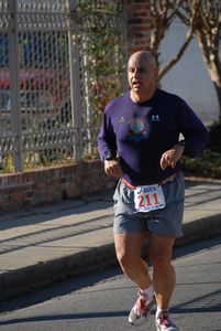 Comments: Lined up just in front of the "Over 50 Minutes" pace sign, which was just a little faster than what I was shooting for. Not completely arbitrarily, I've been training with paces base on a four-hour marathon, which McMillan equates to a 51-minute 10K (8:13 pace), so that was my target time. First couple miles I just kind of went with the crowd. Good thing about these local races is that you can pick out people who you know and and are familiar with their typical paces. Felt a little fast but OK, so I stuck with it down Johnston, through the subdivision, and onto South College. Mile 1: 8:00 Mile 2: 8:02 Mile 3: 8:11 At this point we're out in the direct sunlight and things get warm quickly. Temps were in the low 40s when we left the house so I decided on a long-sleeved UnderArmor, but now the temps were in the 60s and it was too warm. Some of my rabbits began to fade, even saw some of the diehard runners stop to walk. Started to hurt so I slowed my pace down a little. Mile 4: 8:12 Mile 5: 8:12 Mile 6 was hurting bad, plus my Garmin screwed up and dropped a tenth of a mile. Going by feel anyway, but I had to remember to hit the lap button at the mile marker. Picked it up a little on Jefferson Street, was over 49 minutes at Mile 6, which made a sub-50 out of reach so I didn't push too hard... Mile 6: 8:19 Last .2: 7:35 pace(1:36) What would you do differently?: Not much. I could certainly stand to be lighter. Just getting my mileage back up after a fifteen-month layoff, so I'm right where I expected to be. Verifies that my training paces are OK as I continue to train for my goal half marathon in January. Today's pace was about 1:30 per mile faster than last year,0:45 slower than my 10K PR here two years ago. ![]() Post race