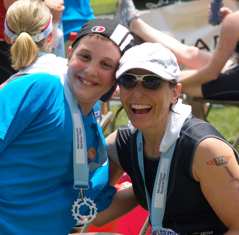 Comments: ok, I was undertrained on the run and knew it going in. The first 5 miles ran with a guy I had been playing leap frog with and then there were others that the whole way we would pass each other - felt good until about mile 8. Though at mile 7ish was wondering if my zoot racing flats were the proper shoes for this distance as both knees and arches started to really hurt. That faded - as did I. From mile 9 started to hurt and from mile 10 on it was BRUTAL. The last mile was a death march with me practically in tears but I still managed to sprint the finish - mostly because my son Noah and the BTers were great at cheering!!! I will say that Spokes and his father's death helped get me through the run - he had asked me to run 1 sub 9 if I could (and I might have in the first few but was not checking splits and by the time I did could not do a sub 10!) I had written on my left forearm: 1<9 4 spokes' Dad and whilst I could not achieve that I could aim for a sub 6 race and did it for him and the others who could not race - the woman in the wheelchair cheering us on the bike, the MR guy cheering us on the run, the patrons of the old age home we passed; I thought about when I am that old do it for the memories of what I accomplished and that got me through the pain. So Scott, I know this is a hard time for you and your Mom, but you really were in my thoughts! What would you do differently?: uh train the run, which for Timberman I will!!! ![]() Post race