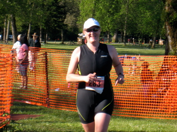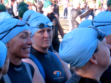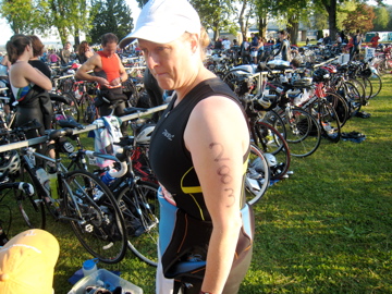 Woke up 5am. Ate 1/2 double chocolate muffin, 1 instant breakfast drink, gatorade. Tried to eat some pop tart but couldn't do it. Arrived at race at 6:30. Set up transition area while listening to the race meeting announcements and walked to start.