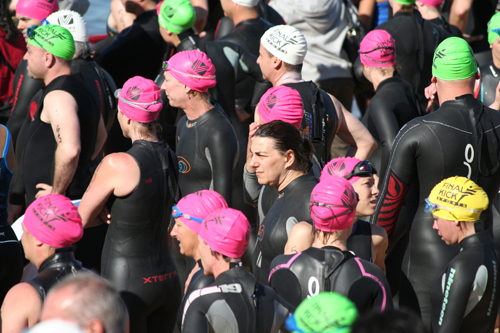 Got body marked and then set up my transition area; I was first onto the rack and got what I thought to be a good position. Had a gel around 30 minutes before race time. Got into my wetsuit around 15 minutes before race time and got a short practice swim. Then hung out for my wave start.