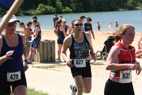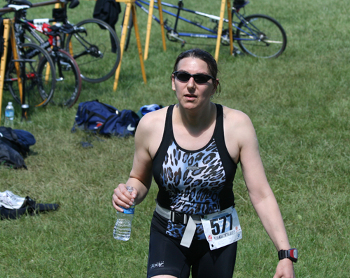 Comments: I just couldn't get my breathing under control and it had nothing to do with the water temp (a balmy 69F). I did FS the short leg out and the short leg in but but gave into my nerves and did some side stroke in between (I'm still kicking myself about this); had to flip onto my back for a moment during the first leg to deal with a leaking goggle. Stayed to the outside the whole way and avoided most of the contact. As I came out of the water I had a hard time stripping the suit because I couldn't find the zipper pull because it ended up hanging in front of me. I beat my target time of 16min, taking 5 minutes off of lasts year's awful swim, but did not have a good swim at all. I'm wondering if the course was short. What would you do differently?: HTFU and SWIM! ![]() Transition 1