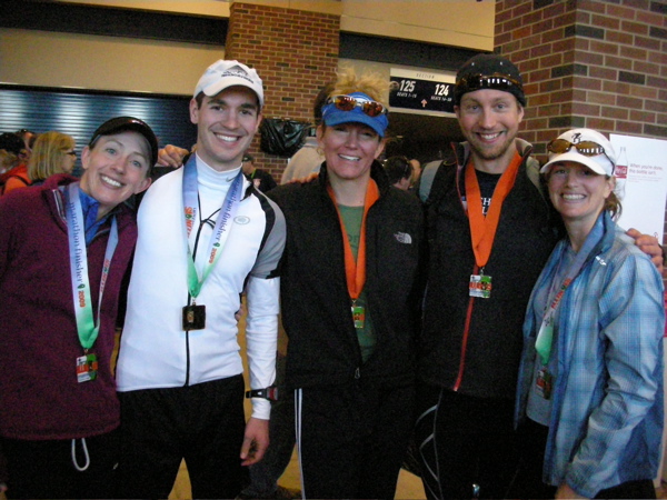 Comments: There was a lot of energy in the start corral, as well as a lot of navy and orange. U of I people have some serious pride I tell ya. We joked around and were grateful for the warmth of being packed in since it felt like the 20s with the wind and we were all scantily clad in our 50* running gear. Eventually we listened to the national anthem and then the announcer counted down the start. "10...9...8...therestofthenumbers...GO!" And then we stood there. After a couple of seconds the guy standing next to me yelled, "My world hasn't changed at all!" As soon as the words were out of his mouth the mass of humanity in front of us began to move - falteringly at first but with increasing momentum. And then we were off. I tried hard to keep the pace I had planned on in training. I was a few seconds fast, but overall was pretty close to my target. I felt calm and my pace felt controlled. I could tell my legs would like to go faster, but I kept them reigned in. I also made sure to thank every volunteer I saw on the course for being out there. This race almost didn't happen due to lack of volunteers and the community really stepped up. I wanted them to know we appreciated it. About seven miles in I started running with a guy name Mike and we chatted. We ended up running together for the next 10-12 miles or so and my pace was solidly where it should be. Around mile 17-18, when I lost Mike, it started getting tough. We were on the back side of the course and the wind had really kicked up. Most of the last several miles were into the wind and it seemed like there were a lot more false flats in the second half than there had been in the first half. I had a really slow mile - 8:40. I forced myself to focus and try to keep pace under 8:30 for the next few miles. I pulled it off, but I could tell I was digging way too deep with two miles still left. I hoped to push through and keep it up anyway, but my legs put the smackdown on that plan. The consequences of my attempt were swift and sure. I was back at an 8:40 mile only now it hurt far worse than it had before (which didn't seem possible). The wheels were definitely starting to fall off. I had let go of my goal finish time (3:36-3:37) and focused on what pace I had to run for a BQ (3:40). As I entered the stadium I suddenly heard Laura screaming "Go Kelly. RUN!!" Although I think she was just screaming loudly to cheer me on I felt like I could hear the panic in her voice that I was feeling. I knew it would be close and I knew they knew it would be close. I mustered everything I had (I'm still not sure where it came from) and picked it up just a bit. The run through the stadium involved two left hand turns to get you to the two far corners of the field and then a straightaway into the finish. When I turned the first left I glanced at my watch (3:39:XX) and at the finish clock (3:39:XX). Ohgodohgodohgodohgod. I focused straight ahead and ran as hard as I could. As I turned the last left into the finishing stretch I looked at the finish clock and watched in desperation and horror as the time ticked away and I felt Boston slipping through my fingers for a second time. And AGAIN it would be by mere seconds. 3:40:54, 3:40:55 Please, please, please. 3:40:56, 3:40:57, 3:40:58 Noooooo. 3:40:59, 3:41:00 And then I stepped under the clock and onto the finishing mat. Mile splits: 1 08m 06s 2 08m 15s 3 08m 06s 4 08m 07s 5 08m 22s 6 08m 17s 7 08m 16s 8 08m 11s 9 08m 10s 10 08m 23s 11 08m 06s 12 08m 09s 13 08m 06s 14 08m 01s 15 08m 07s 16 08m 20s 17 08m 05s 18 08m 19s 19 08m 17s 20 08m 44s 21 08m 10s 22 08m 27s 23 08m 15s 24 08m 29s 25 08m 44s 26 08m 50s 27 05m 00s 08m 17s /mile (.6 miles according to my Garmin) What would you do differently?: I possibly could have started out just a bit slower, but I'm not sure just a few seconds a mile in some of the earlier miles would have made that much difference. I wasn't prepared for the wind in the second half. And I think I need to do longer long runs in training. I didn't start to really fall apart until I surpassed the longest distance I'd run in training and I think having forced my body through longer miles prior would have made me better prepared on race day. Overall though, this is about the strongest I've ever felt for a marathon and I did the best I could. ![]() Post race