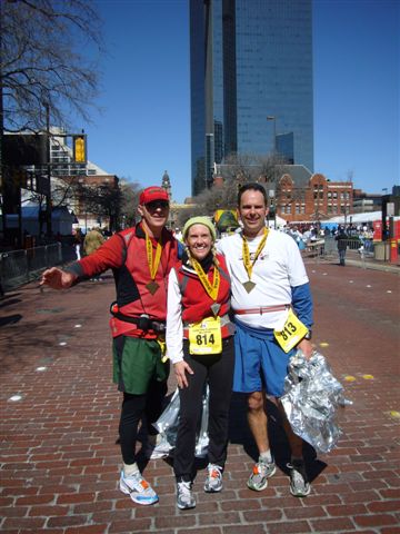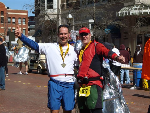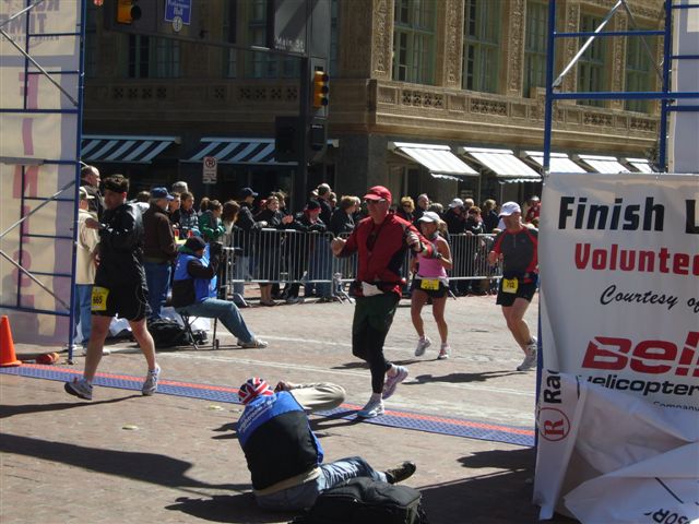 Comments: Considering I'd tweaked my left hammy the night before in my soccer game and had my bowels mutiny on me, I'm psyched to have only missed my goal by 4 minutes. If not for the 3 trips to the porta johns (miles 12, 16 and 21) due to whatever stomach virus decided to rear it's ugly head, I'd have made it. Overall run was pretty much a blur to me as I was making sure not to over exert the hammy, keep the wrap on it, focus on finding the next porta john and, after making a pit stop, trying to catch my brother and Angela. I caught Angela all three times (barely) but just couldn't get the leg to let me accelerate enough to close the 1/4 mile gap Gib had on me. Having those rabbits to chase kept me focused, though. What amazes me, is that the running gods were smiling and not more than 2 steps (literally) across the finish line, my entire left leg seized up. Really, ask Jeepfleeb. He was at the finish as I was grimacing and leaning on whoever would help hold me up. After about 5 minutes it unlocked and I was able to limp around the finishers' area for some food and yet another pit stop. What would you do differently?: Umm, not injure myself the night before? I can't complain, though, as it was in the first half of the game, which I had decided to play. I wasn't going to play the second half, but was called back into action by not having but one sub. We got smoked, too, so it was like a double whammy. ![]() Post race