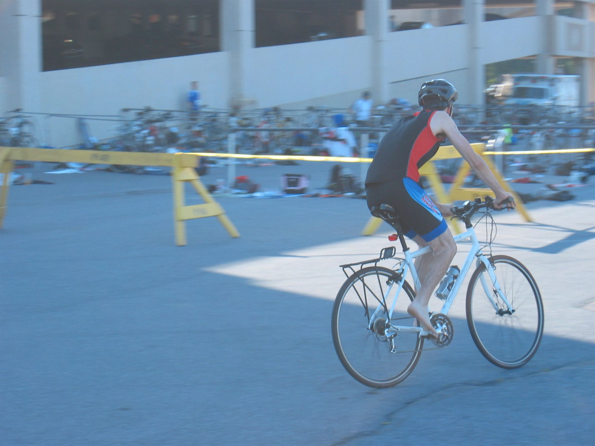 Comments: So I leave T1 shoeless hoping they will appear somewhere. They don't. Not knowing what to really do I hop on my bike and just take off. So, I biked the 14.5 miles without shoes, which, while uncomfortable, was not all that bad. I certainly wasn't at top speed, and thank goodness the road is completely flat, but biking without shoes isn't the worst thing in the world. What would you do differently?: Wear shoes, 'nough said. ![]() Transition 2