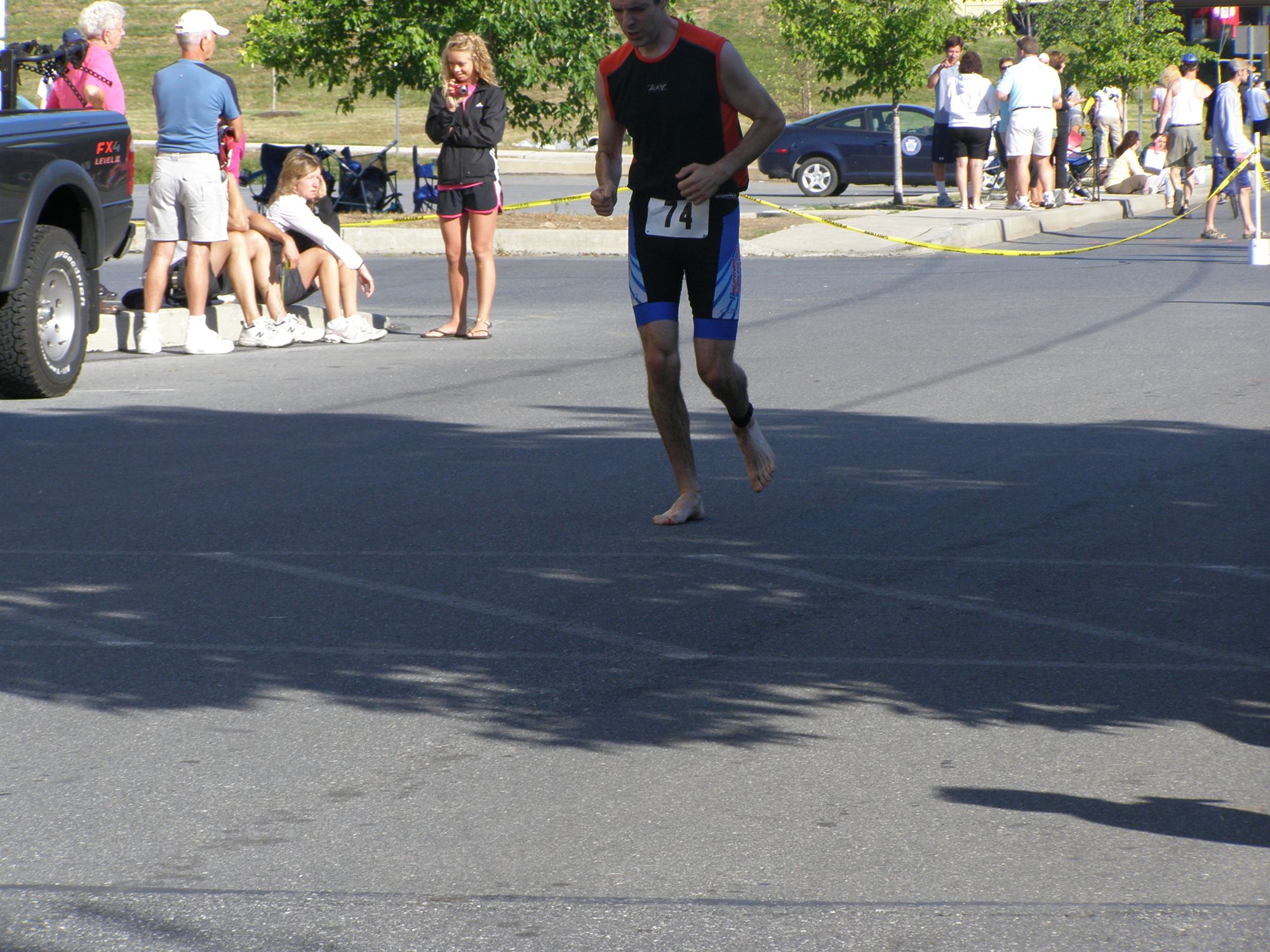Warm down: Goal for my warm down: Find shoes. Turns out my shoes were with a pile of other shoes 40 feet away from transition. Joel informed me that the "shoe return" is not designed for race shoes, but flipflops. That way people set up their transition area and race shoes and just wear flip flops to the north point of the island. Oops, now I know. What limited your ability to perform faster: Obvious Event comments: Well, considering I was barefoot for the entire race I am actually happy with the results. I finished in 1:34 and my "wearing shoes goal" was 1:35. The shoe thing did prevent me from really pushing myself physically, but all in all I am okay with the way it turned out. By far the best part of the race (in addition to seeing Abby and Eli cheer for me) were the direct comments, spectator whispers, and curious looks I received. The best by far was "Wow, going oldschool, nice!" I actually had to laugh as the guy who said it flew past me on his bike. Oh well, on to Pinchot in September. Last updated: 2009-03-12 12:00 AM