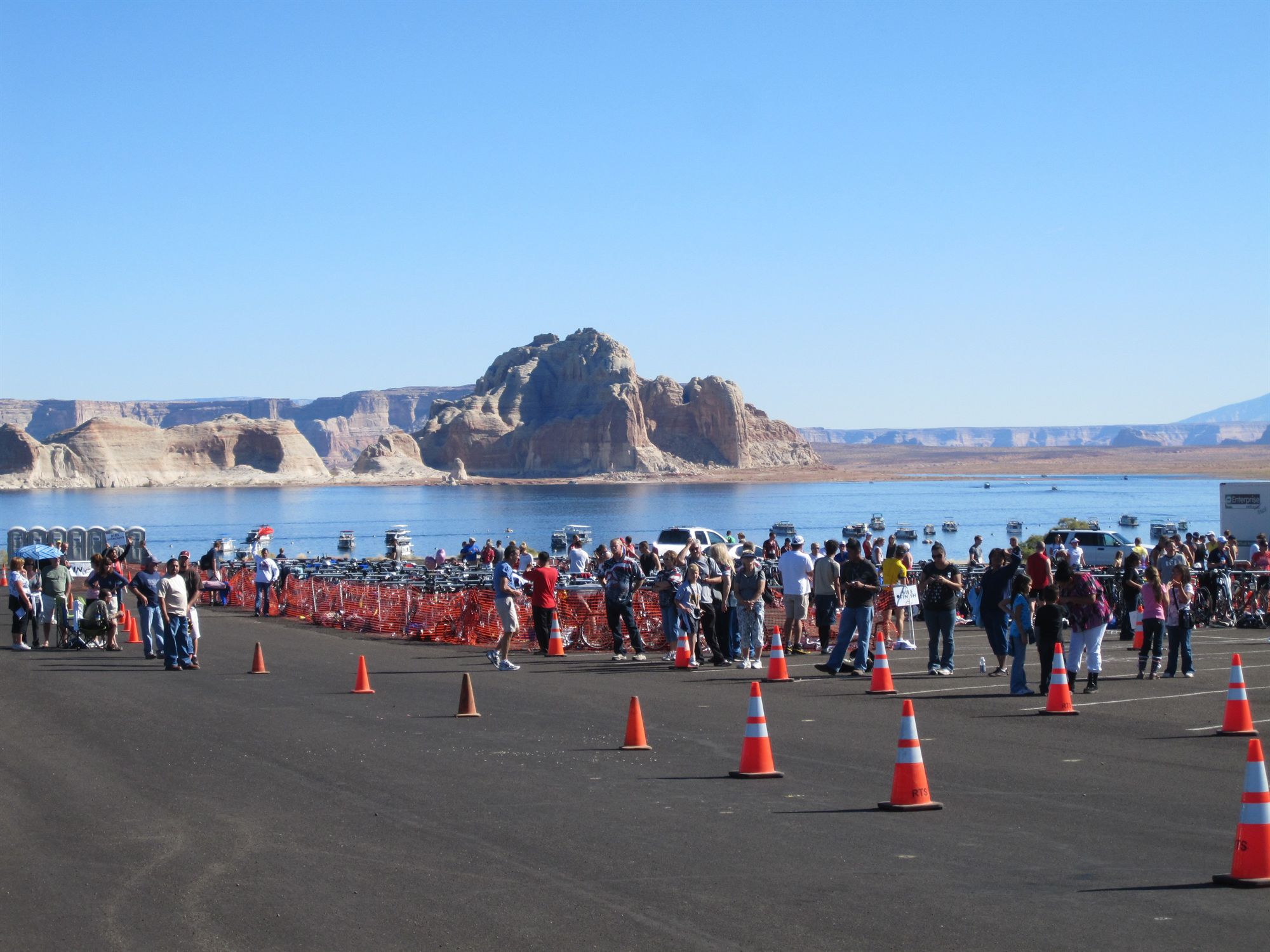 - Description: The Powell3 Triathlon Challenge takes place in the Glen Canyon National Park and swims in Lake Powell at Wahweep - State Line Marina. The swim starts with a few wave starts and in water start. The air and water temperature this time of year averages between 70-75 degrees. The swim is a triangle swim of 750 Meters for the Sprint and the Olympic does this twice for 1500 Meters. Transitioning out of the water you will run up the boat ramp around 400 yards and then ride a 12 Mile Loop around Glen Canyon National Park (twice for the Olympic at 24 Miles). The bike course has a step climb between miles 4 and 6 but it will be worth it because there is a downhill the rest of the way back to transition with views of Lake Powell on the way down. The run course is an out and back running up the East side road. Sprint will turn around at 1.55 Miles for a return trip of 3.1 Miles and Olympic will turn around at 3.1 Miles with the return trip at 6.2 Miles. This course is beautiful and incredibly landscaped.