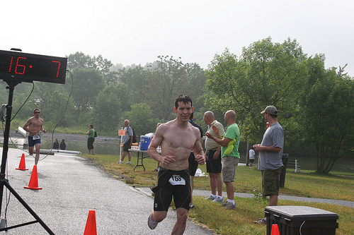 The swim course is marked with large orange buoys. When the horn sounds, you will complete a single 0.4 mile loop. After exiting the water, it’s just a short run to the transition area.