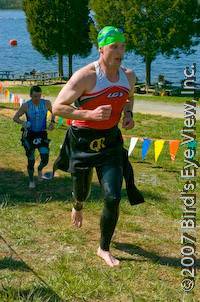 The Sprint run course starts with a serious climb out of transition on the main park road. You will be tired coming out of T2 but it levels off for the middle section of the course as you run along the forested cabin and campground loops. There is a large down hill towards the finish line where athletes will finish by veering 15 degrees off the beach sidewalk into the finishing chute. This is a scenic and seriously fast run course once you get past the first 1/4 mile.