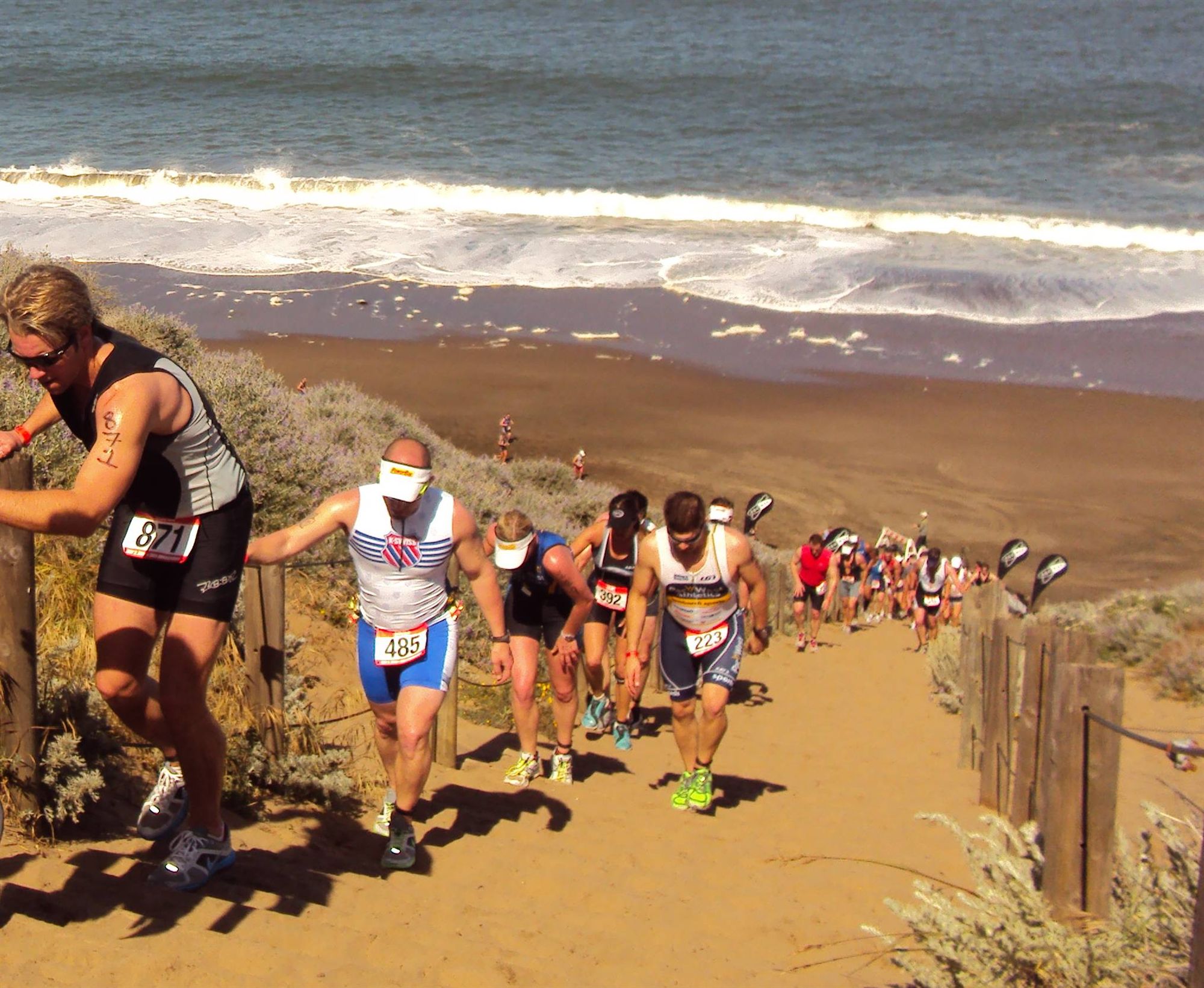 - Description: The world’s top athletes from around the globe take over the streets and waters of San Francisco for this prestigious triathlon. Showcasing the beauty of San Francisco, triathletes embark on a 1.5 mile swim from Alcatraz Island to the shoreline of Marina Green, an 18 mile hilly bike ride through the Presidio and an eight mile trail run through Baker Beach to the infamous Sand Ladder. This world renowned triathlon, in which only 2,000 triathletes and relay teams can participate, sells out within hours of the registration opening each year.