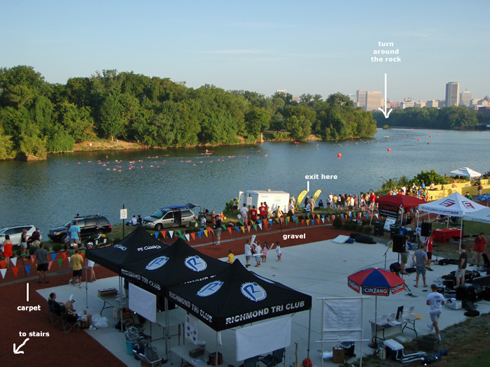 - Description: The 1.5k swim takes place in the beautiful James River with July water tempatures typically in the high mid 80's, meaning it will probably not be wetsuit eligible. The river is tidal so there could be a small current, but no jellyfish or nettles. This area of the James is just before the fall line where the rock beds start at Brown's Island (Xterra swim course). Due to the rock fall line the tide stops there, and currents are slowed. With many swims practiced now from Rocketts, the current is very minimal unless there is a significant rainfall.