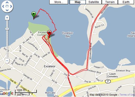 Run: 3 miles along the shores of Lake Minnetonka on the Three Rivers Park light rail trail. The trail is very flat and made of hard pack clay.