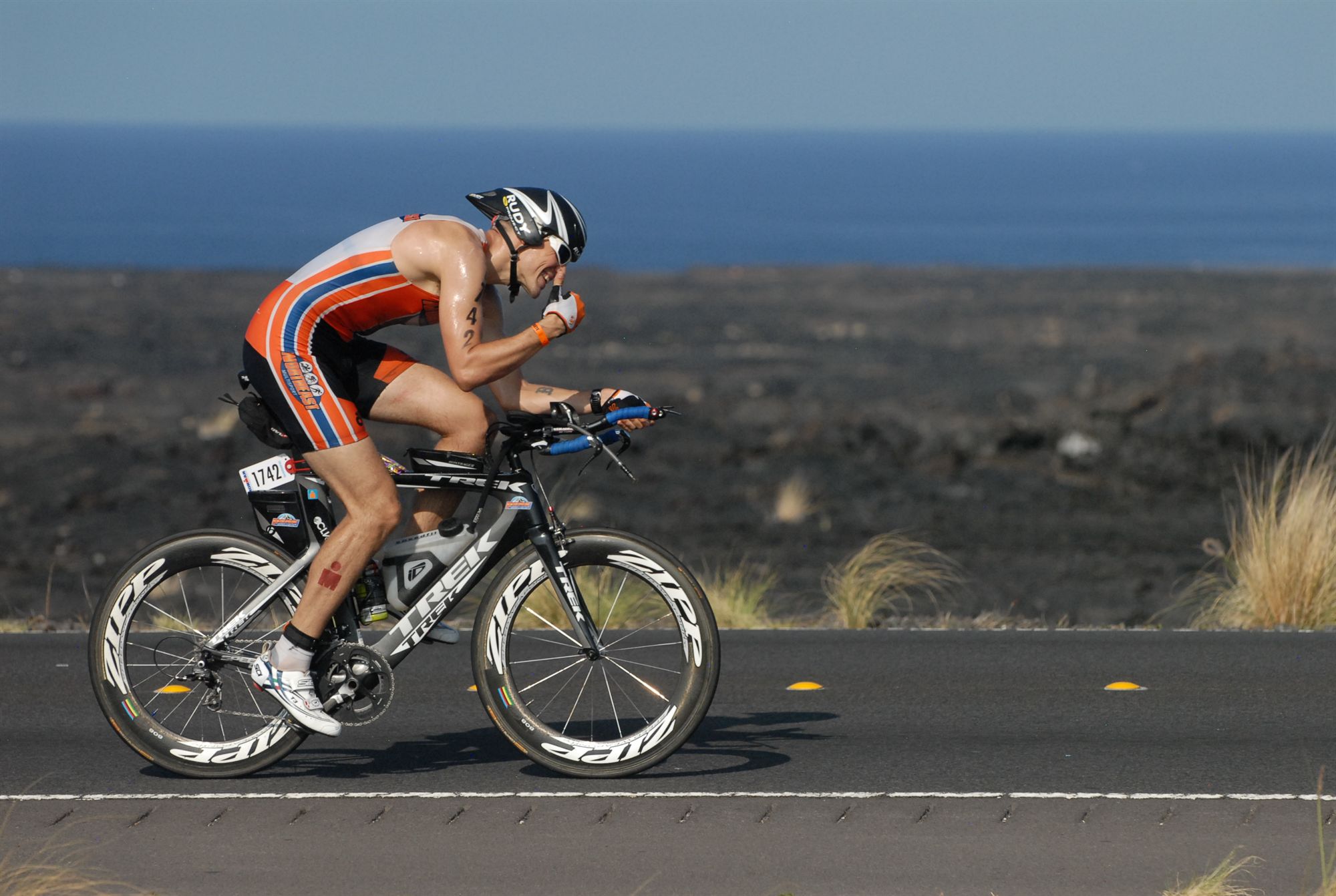 In 1981, the race moved from the tranquil shores of Waikiki to the barren lava fields of Kona on the Big Island of Hawai’i. Along the Kona Coast, black lava rock dominates the panorama, and athletes battle the “ho’omumuku” crosswinds of 45 mph, 95 degree temperatures and a scorching sun.