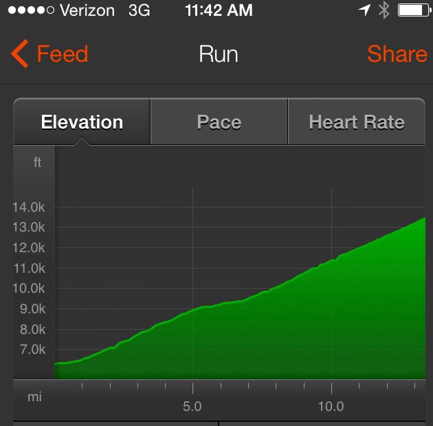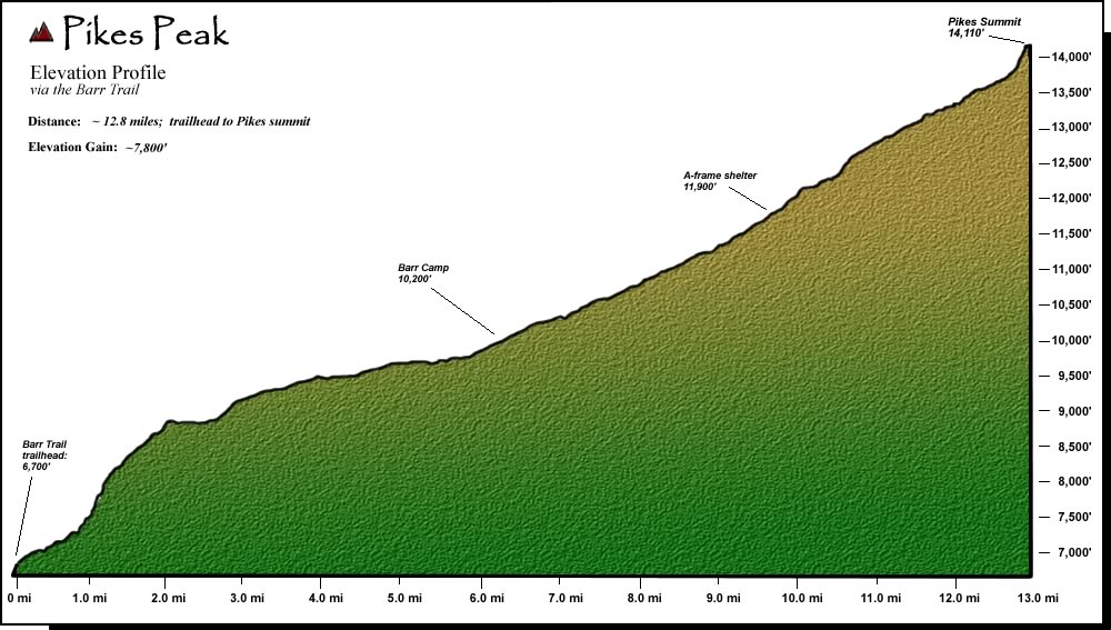 - Description: 13.32 mile trail run starting at an elevation of 6,295 feet and climbing amost 8000 vertical feet to 14,110 feet up the Barr Trail.