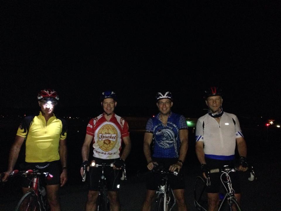 Comments: Went straight out to US42, then into Covington, across the 5th Street Bridge to Newport, then Purple People Bridge to Cincinnati, and straight out to Lunken. Started doing laps at Lunken with Scott. Soon Peggy showed up and then Kevin. Channel 12 showed up around 11ish so I stopped and did a report with Joe Webb. After that, I had people doing loops with me all day and night. Friends would come to pace me and let me draft off them. Sometimes I had one person, sometimes I had several, but I was never alone. Some wanted to slow down and talk a bit, and some wanted to pace me and were on a mission. I had a awesome fun time doing this. The day got a bit hot in the afternoon hours, and I knew I was getting a bit burnt. Karen brought some sunscreen, so I put some of that on at one point, but I'd find out later how much sun I really got. Karen also went to Newport and brought me a pizza!!!! I think I ate at least half of it all by myself, one piece and one loop at a time. People kept coming and dropping off all day. Karen' s parents, Mike and Pat brought me the best cheeseburger I've ever had. They also showed up with signs that lit up and cowbells! WOW!!!! When it got dark, Larry Brown was pacing me through the dark! Larry must wield THE FORCE, because we were cruising into the 20s at many times, and he couldn't see but a few feet ahead, but I just hung on to his back wheel and we rocketed through the inky blackness! WOW, that was a trip! We were kicked out of the Otto Armledder park after dark, so we went back to the 5 mile loop around Luken. We did several OUT AND BACKS to stay off the main road in front of the airport, but eventually, that got old, so we went back out to the main road. That turned out fine, because traffic had died off. I didn't feel bad at all on the bike. Drafting, even at higher speeds, turned out to be a low effort, but I wondered what the overall effect would be on me once I strapped my running shoes on. Time would tell. We told many stories out there on the loop to keep my mind from turning to mush. This made the time fly by. We stopped at every loop to resupply. Mary always had me a fresh drink and kept me on task with drinking and eating. If my bottle came back with too much in it, she would remind me to drink more. I finally got off the bike around 10:35 pm, and already had my pace runners, Emily and Steve, waiting for me! Em brought me coffee too!!!!!! I was happy to get off the bike, and ready to run. I wasn't as tired as I imagined I might be, so that was surprisingly nice. Nothing hurt, and I was just a tad stiff, but that was expected. Over all, I had a great group of friends who kept me on task and gave me what I needed when I needed it. Time to run. ![]() Transition 2