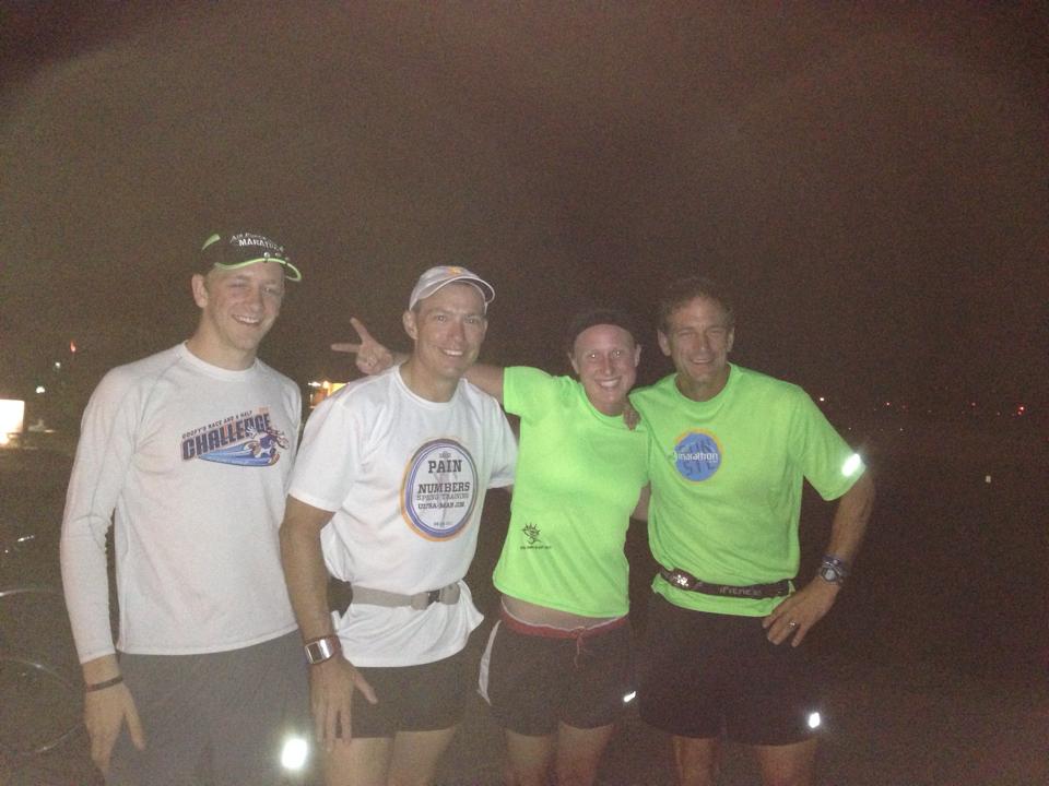 Comments: Emily, Steve , Andrew and I took off into the darkness. The run legs were not as bad as I thought. We were actually doing sub 10 minute miles. My plan was simple....run at the speed I felt comfortable at...NO PUSHING. I knew as the miles ticked off, I would slow down, and that was just fine. The weather was pretty good, but a little more humid than usual for this time of year. My breathing was faster than normal and I was sweating more than usual. Jon would later say that I was sweating the same, but he humidity was not allowing it to evaporate from me....nope....I was sweating more....sorry Jon. ;) We talked a lot. That was my requirement...talk. Tell stories...jokes....anything...just talk. All of my running partners had no problem with this. Sometimes they told me to let them know if they were talking to much, but that wasn't possible. On we went around the perfect 5 mile loop around the airport. Sometimes we'd pick up and drop off runners at the "transition" area where Mary was at, and sometimes we'd meet them as they ran up behind us or circled opposite to come find us. Every lap, I'd stop to eat, get a new water bottle and pick up or drop off runners. There's no way to count off all of the runners who came out to run with me, especially when my Pain By Numbers running club showed up at 8am. Let's just say it was less than 100 but more than 20. My mind was getting a bit foggy there in the end. We told so many stories and talked about so many things. People would ask if I was "hurting" and I'd tell them my feet and knees hurt, but that it was expected. Really, overall, I didn't hurt THAT much, and I wasn't THAT tired. I was stiff, tired and sore, but no more than my mind had already prepared itself for. After a few ULTRAs now, I think my body and brain knew what it was in store for. Loop after loop. Looking at the stars, the airport, and finally the sunrise. I was so happy to see that sun come up, but now my brain was really sluggish. I kept forgetting what day it was, mostly because of loosing a day of sleep. I was very, VERY conscious of making sure I ate and drank plenty. Until it got down to those last 2 laps, it seemed like this was taking forever. When people were walking as fast as I was "jogging", I knew the pace was getting crazy slow, but that was all I had left to give. What probably surprised me more than anything is my ability to stay awake and not feel sleepy. I'm usually the type of person who can't stay up past 10pm, but as long as I keep moving, it seems to do the trick. Don't sit, and don't lay down. There really isn't much in the way of details to give. Run, listen to stories, talk, but just keep plowing ahead, knowing that each step forward brings me closer to the finish. When I had one lap to go, I calculated that I'd have just over 2 miles to go when I came around again, so I'd have to do a little "out and back". Ugh. My PAIN BY NUMBERS group had showed up for the last couple of laps, AND SO DID HALEY! Several showed up at 7ish, but the main group was there at 8. It was so nice to see so many fresh faces. My pace was agonizingly slow for this group of runners, but some held back and stayed with me. I let them know it was OK to get their workouts in and to take off. I didn't want my event mess with anyone's actual training. Some of my friends parents showed up with signs and cow bells, which made this loads of fun! I finished my last full lap and started for my little out and back. We made it out a mile and I could tell my body knew it was almost over. It was anticipating the end and was starting to shut down. My brain and body was turning off the lights one switch at a time. As we started back, the larger part of the group ran ahead to form a tunnel for me to run through, but a couple of people hung back with me until about 100 yards to go. I ran to the finish, slapping hands on both sides of me, then ran past them about 20 feet until my Garmin confirmed I went the exact distance. I didn't want to short this even 1 foot. Done. Done. and DONE. We took pictures and I finally sat down. The group went down to have coffee and bagels at Bills car. Mary came to get me to walk me down to have a seat as she brought the car around. I had a bagel and coffee, then got into the car. Home. Home to take a shower and sleep for the next 16 hours. What would you do differently?: Nothing. All went exactly to plan. Hard to believe. ![]() Post race