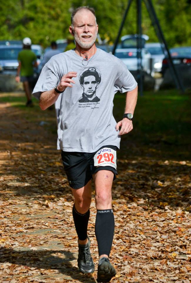 Got our numbers and stood out by the car where the sun was warming up things nicely. Milled around with runners and listened to the new Meat Puppets lp on the iphone hooked up to Jon's car speakers.Jon made fun of me for wearing it, but decided to bring the mp3 player along. Decided to bag the belt with the water bottle. Didn't really need to drink water during training runs of 2+ hours in warmer weather than this and there were to be two water stops. Prerace speech informed us that the trail markers were bright yellow and that due to the fallen leaves they'd pretty much blend in. Fortunately there are white blazes on the trees too. Loosened up a little but no real run warmup.