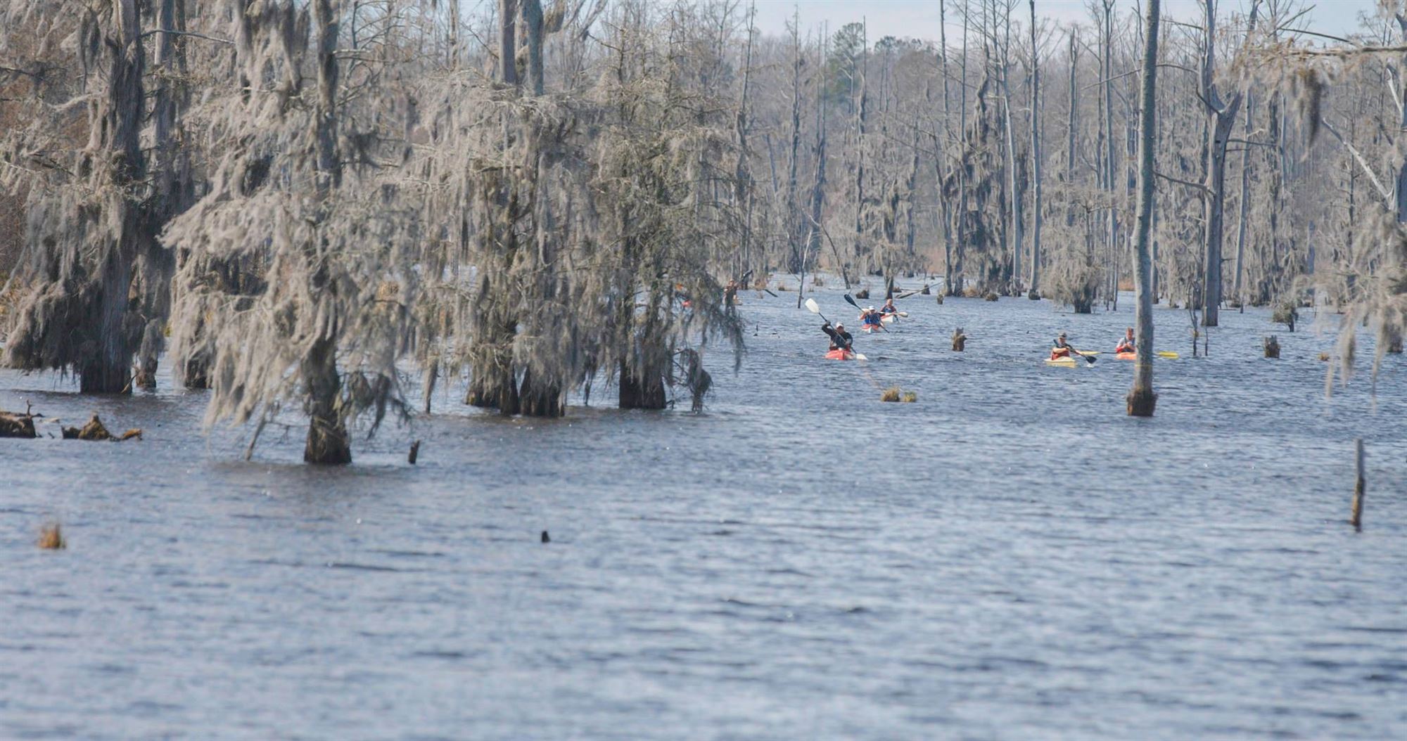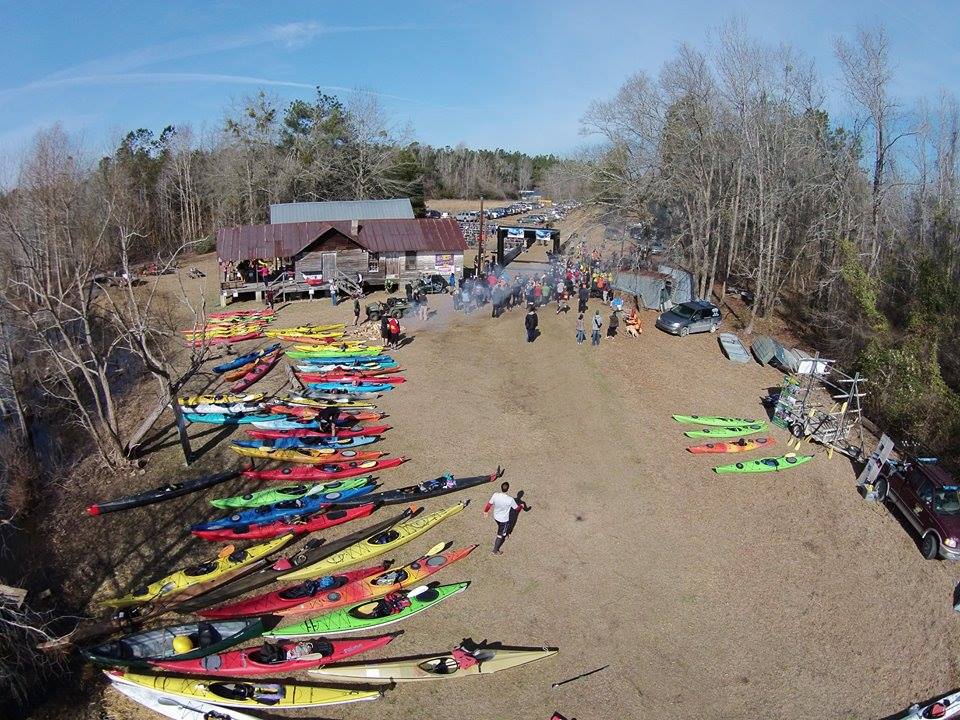 The course is built on a beautiful & rugged wilderness setting including two-hundred year trails, a 75-acre pond, blackwater swamp, and at its heart, the South Edisto River. The transition area is perfect for spectators and crowd support. It is set up so that participants pass through “race headquarters” four times before reaching the finish line. Almost half of the kayak segment of the race is visible from where the transition area is set up off the banks of the lake, where there are two cabins set up to accommodate spectators and athletes.