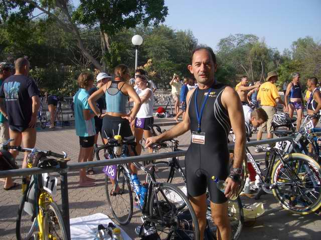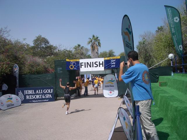 Warm down: Jogged lightly for another 10 minutes and walked for a further 5. Stretched plenty and kept moving around for a good while. What limited your ability to perform faster: Lack of experience first of all. I know now I can push the envelope quite a bit further. To shave 10~15 minutes of my time should be within reach, not even considering the swim. I reccon I can be under 1:15 by the end of the season. We will see. Breast stroke is a definite NO. I have to fix that ASAP. Event comments: The venue was probably the best one could think of. It took place at the Jebel Ali Golf Resort and Spa, just outside Dubai, UAE. This is one of the most prestigious and luxurious hotels in Dubai. The organization was top class with plenty of volunteers and a very professional job at all levels. At the end of the race competitors could shower at the luxurious Club and change into fresh clothes for the brunch and presentation. I loved to see one of the local bike shops setting up a full mobile workshop to assist anyone with free service before the race. There were representatives from the local Tri club, the ITU, the 15th Asian Games - Doha 2006, the UAE government (Sheik Makhtoum Hasher Maktoum Al Maktoum). Only one negative point: the company that was supposed to provide championchips timing system withdrew and timing was only manual for the finals. I got my splits from the Polar HRM. That will be a no issue next time we were promised. Last updated: 2005-04-15 12:00 AM