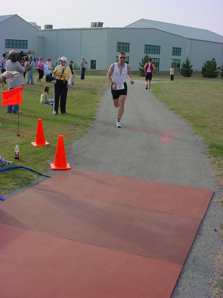 This was my first tri with a bike that actually went outside (see my other race), so I was very excited to see how I stacked-up on real terrain. There was this hill about 1/2 mile into the bike that kicked me in the rear and slapped me in the face. I managed to pass someone without coming out of the saddle, so I felt pretty good about things. I'm amazed by the great sportsmanship in this sport. As I passed that dude up the hill, all we said were encouraging words to one another, like "stay in that saddle!" or "I see the crest, you got it!" Great stuff. Anyhow, the rest of the bike was on this straight road with some rolling hills. I passed a couple of people and got passed by some dudes in their superbikes. All in all, I was pretty satisfied with the ride as a whole.