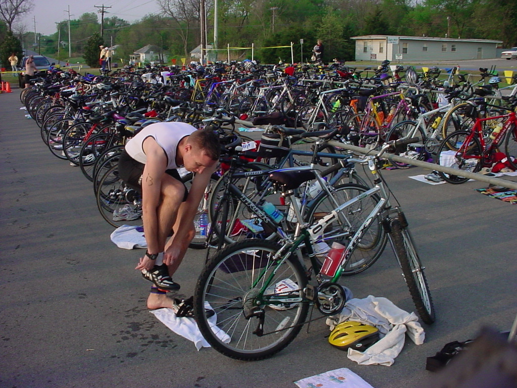 It was dang early (5:45am) when we headed from the hotel towards the tri site about thirty minutes away. My wife and I had clif bars and bananas to eat and water/gatorade to drink. After getting lost, we came squealing into the Claremore Recreation Center at about 6:45am. Lots of stress and lots of rushing awaited us. Fortunately, Mr. Trist (race director) helped us out and we got our numbers, shirts, race belts, and such lickety-split (thanks Trist!).