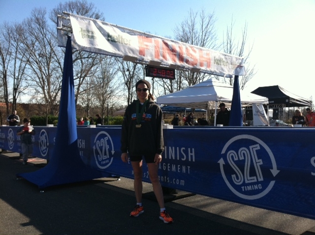 Comments: This was an inaugural race with only 200 5K participants and 300 Half participants, both starting at same time, so we decided to start towards the front of the line. I did not see a chip mat, so I figured it was totally gun start time. We're off! Both Pete and Bill took off harder than I did, so I just found my pace and plugged along. I think it was around mile 4 when I finally saw Bill again, but it took me a really long time to catch him. On a race this short, I doubted I would be catching Pete. The houses were all decked out for Christmas! The spectator support was more than I expected for a small inaugural race. The course was HILLY! I've done Thunder Road twice and it is heavily advertised as a hilly course saying 'Flat Is for Sissies!" I was thinking that if I can do Thunder Road, to be sure I can handle THIS. But Thunder Road has tons of little rollers that you just roll right over, this race had REALLY LONG curvy inclines! The hills were becoming disheartening. At some point I honed in on a lady who I swear runs EXACTLY like I do. I felt like I was following myself. At some point I passed her and she followed me and we eventually ended up side by side so I decided to speak to her. I said, "wow, you're an awesome steady runner!" And she said, "No, YOU are; I'm pacing off of you!" We kept each other going, but I was pretty sure she was in my age group and that I would have to try to ward her off at some point. The moment she paused to grab a cup of water was the moment I made my move to get in front of her before the finish line. There was one other lady running fairly close to my pace that appeared my age group, but she was a pinch faster and I didn't have enough left in the tank to pass her. Heading down the finish chute was downhill, so we were able to enjoy those last few moments of coming in. I saw the clock was closing in on 1:54 and that number resonated with me for some reason. Wasn't that my goal time for Tobacco Road? (flat course). I think so! I think I'm going to beat my Tobacco Road goal if I can hit the chip mat before the 1:54! WHERE is that chip mat!?! There were no "visible" chip mats in this entire race. But I finished in 1:53:57! Finish Line Video! My finish is at 53:10. http://www.ustream.tv/recorded/18901017 What would you do differently?: I don't think I could have done any better; if so, not by much. I did wish for my thin gloves during the race, but was thankful that I changed clothes at the last minute. I have absolutely no hill training, so that's the only thing I could have done differently to prepare. ![]() Post race
