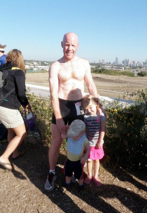 Zoot ultra shoes with socks this time, old zoot shorts, no shirt.