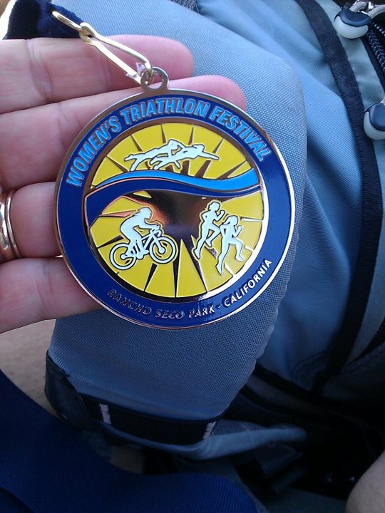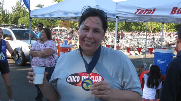 Comments: So, I made it this far, the last mile should be easy, right? This was harder than I thought. Now, when I first started training in April, I could not run at all. I finally can now run 3 miles without stopping, but after the bike, I had no energy to run. I tried at first, and nothing happened, I only could walk. It took about an 1/8th of a mile before I could start jogging. I just couldn't catch my breath. In fact, the only time I felt like this before was during an asthma attack. Eventually I got my running legs back, and was able to do a slower version of my normal ultra-slow run. I knew I was slow, but didn't care. In fact, a power-walker passed me easily. I was able to pass a few people, The best part of this was seeing the other women of all ages, shapes and sizes. I gave them encouragement when I saw they were struggling like me. That was wonderful. When I encouraged them, I felt their encouragement for me! When I got close to the finish line, I couldn't believe it. I was finishing! There was my husband, cheering for me! I passed the finish line and heard my name called. That was priceless. What would you do differently?: I need to practice brick workouts. I also need to increase my cardio and run faster, as well as run longer. I also am desperately in need of new running shoes. ![]() Post race