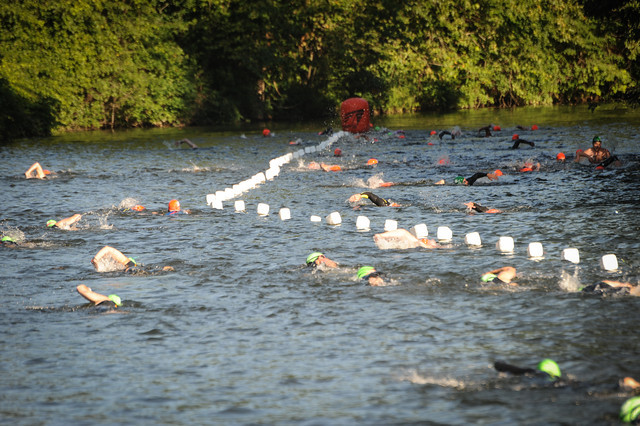 I did not do a lot of pre-race warm-up of the sort I might do for a running-only race, which I probably should do. I did do a swim warm-up from the swim exit (near transition) to the swim start (near the bridge) which was helpful for warming up my swimming muscles.