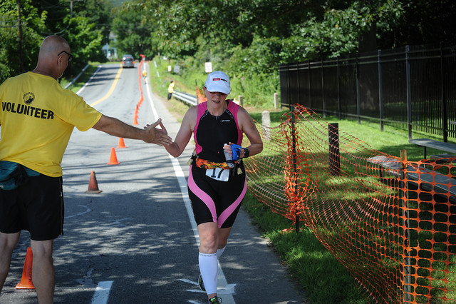 Comments: - Had goggle issues (water leaking in) for much of the swim, causing me to slow and stop several times for adjustment. Also didn’t properly defog lenses. Next time will use training (bigger) goggles that I know seal well vs. “race” (smaller) goggles that occasionally don’t sit quite right. - The warm-up swim from swim exit to swim start was a good idea and got me comfortable in the waer, although I apparently didn’t notice or take sufficient action on the goggle issues. - Still need to work on my swim efficiency and kicking. No progress since Litchfield Hills last year (2:22 pace). 3 Sprints with wetsuit earlier in the year had paces 2:04-2:18. - Not seeing the up-river turn-around buoy (around the river bend) was a little disconcerting, not being able to visualize how far I had to go until I reached the bend and was almost there. Similar issue down-river as the bridge was tough to spot in the glare of the sun. However, the line of white buoys was very comforting, and I didn’t have to sight forward, just kept an eye on the buoy line. Stayed a little too close at times, knocking a couple buoys with my stroke. - I was coming out of the water just as the horn was going off for the first Sprint wave. I decided the horn must be for me and the other 2 ladies scrambling out at the back of the pack. Yay us! What would you do differently?: Use better goggles, and de-fog properly. Need to work on my swim pace and stroke efficiency, but this is not new news.3 ![]() Transition 1