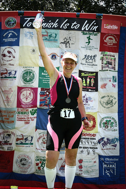 Comments: - The run was tough. I was a little spent from the bike hills, and it was hot. I managed to keep “running” (slogging) up the first hill out of transition, and settled into a good pace when the course flattened out. I managed paces of 11:54, 11:52 and 11:21 in the first 3 miles. Then I got to the bridge, and in the shade of the bridge I slowed to a walk to gather myself and prep for the hill. I started back into a jog as I exited the bridge, but the momentum had gone…after a few yards of the steep hill I decided I was better off walking the hill and conserving my energy for a faster pace post-hill. After cresting the hill, I alternated walking and jogging but never got into a good rhythm. My lower back (right side) was hurting a bit, I felt like my core muscles weren’t engaged enough and tried to suck in my gut. I had a gel or two, but hadn’t really planned out my run nutrition so didn’t force myself to stick to a plan. I had a palm water bottle and drank when I needed and refilled at most of the water stops. I let them spray me and used wet sponges. What would you do differently?: Plan nutrition and stick to it. Pace myself in the early part of the run to conserve some energy. Do more core work during training. ![]() Post race