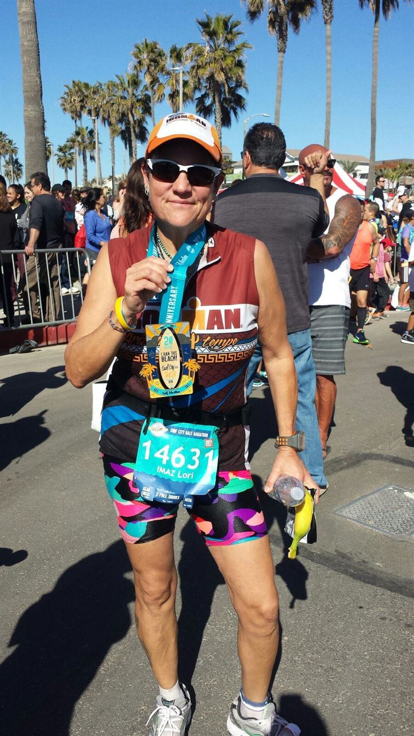 Warm down: About 3 bottles of water, a bag of blue corn chips, and a 5 block walk back to the hotel. The shower was to die for.... What limited your ability to perform faster: Having to overcome a 2 month layoff to heal a slight hamstring tear, from September to November. Had I not had that injury, I would have set a new PR, no doubt about it.. Event comments: Well, this was quite the race for me. Coming into this race, I had the death of a dear friend on my mind, and nervous concerns about my left hamstring. In March of 2015, I weighed 169 pounds, out of shape and without motivation. I met a young lady, Victoria, who helped me "get my mind right". She assisted with nutrition ideas and menu plans, and took me to HITT classes on the Marine base. These "high intensity tactical training" sessions every Tuesday, really whipped my ass into shape, while completely rebuilding a fitness base. The additional workout sessions and running sessions paid off in the end. I will forever be indebted to her. I continued to run and work hard. In September, after running 8 and 9 mile training runs in San Francisco while visiting my parents, I returned to the next HITT class, and injured my left hamstring. I tried to gut out my training runs and a few HITT classes, until I could do no more. A trip to the chiropractor and a few tests later, it was determined that I had a slight tear just under my left glut muscle. I was devastated. All my hard work and everything I had gained, came to a screeching halt. I had to start my training over in November, and had no idea if my hamstring would hold up or not. I started very slowly to get the miles under my belt. My dreams of breaking 2:12 in my last half marathon race, were gone. I pushed on following a 12 week 13.1 training plan, and tossed in some bike riding, stretching, lots of icing, and a couple bottles of Motrin. In the end, it paid off. A couple of weeks ago, I weighed myself and tipped the scales at 139. I NEVER gave up; I NEVER quit. I stuck with the nutrition plan and stayed focused, because this was going to be my last 13.1 race, and I wanted to go out with a "bang". When the race started, I went out fast and felt good. I knew it was time to "pay it forward" and to encourage as many women as I could, along the course. It felt amazing. Memories of people doing the same to me over the last 12 years, came flooding back. About mile 4, I jumped on to the shoulder of a young lady that was setting a great pace. I told her I was going to do my best to stay with her so she might pull me to a 2:12, and she was up for the task. About mile 5 we caught and passed the 2:30 pace group. Between mile 7 and 8 we caught and passed the 2:20 pace group. At the turn around by the wetlands, I began to tire. She would stay ahead of me and wave to me to catch her. I did a few times, but when we hit the hill at Seapointe, about mile 11, I could no longer stay with her. My quads started to burn and I just kept moving forward, with one foot in front of the other. I knew that 2:12 was not going to be broken, but I would have a good time. I only glanced at my Garmin a few times during the day. I crossed at 2:14:32 and was so excited. I cried because of the passing of my dear friend Dennis a few days before, knowing I left it all out there, and that I ran this race without taking a walk break. I ran straight thru.. I had the chance to erase my last two half marathon times. January, 2013 I ran the LA New Year's half in 3:10:36. February, 2013 I ran the Surf City half in 3:10:28. I shaved off almost an hour this time.. Not bad for an old fart...... I want to thank my husband Ron, for sticking by me "just one more time".. My friends Omar and Yesenia for taking the time to come to the start and stay until I finished.. My neighbor Rita, for keeping me company and being my mental "sherpa".. To Jeff, my running mentor and my triathlete mentor. You were a great sport with my pestering questions about running and just about anything. I will be forever grateful for you being there all day and into the night, recording my every move as I pushed on thru to finish my one and only Ironman in 2009. And lastly, to Victoria. Thank you for your patience, your competitiveness, and your brutal honesty. You were a big part of my being successful in this race, and for beating into me, the belief that I could finish this race strong. I encourage everyone to run this half marathon at least once. It has always been a well supported race with lots of volunteers.. The different bands along the course are fun to hear and the spectators are always there to cheer you on.. Thank you Pacific Shoreline/Surf City for some awesome memories!! Last updated: 2016-01-25 12:00 AM