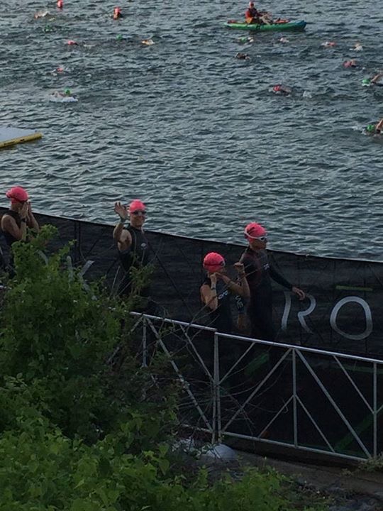 Nothing, too nervous. Found a fellow teammate and got in line with her. Another teammate showed up and the 3 of us hung out and chatted. Took my mind of being nervous. Swim line was LONG!