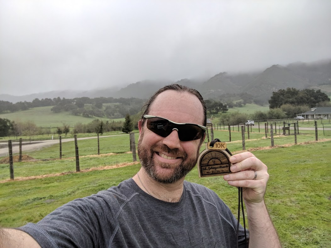 Comments: As the race started the heavy mist let up so I felt good with my decision to leave my rain jacket behind. Starting from the floor of the valley the trail gently sloped up as we made our way to the first climb. The slope gradually increased for the initial 1.5 miles to a meadow plateau and the first of many great views of cloud shrouded oak topped hills and emerald green valleys. A short steep climb at the end of mile 2 led to another meadow followed by the highest climb of the run. From there a rolling decent into a valley made for some good mixed terrain and runable conditions. In trail running I have a saying, "what goes down must come up" and this was especially true with a ridge line between the floor of the middle valley and the finish area. This climb out of this valley was moderately steep and went on for almost a mile with a couple false peaks. The other saying is "what goes up must come down" and the descent started steep but then opened into a gentle meadow for a fun stretch of running to the finish line. What would you do differently?: Good run, happy with my performance. ![]() Post race
