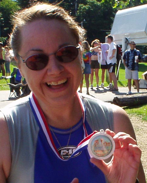 OH MY GOD! I almost DNF'd. I have NEVER in my life been that afraid before in my entire life. The water was so cold it took my breath away and I started to hyperventilate. I turned around with EVERY intention of DNFing and then a calmer voice took over. A woman near me was saying "I can't do this, it's too cold" and I thought, no, she can do this, I can do this, we trained for this. I can do this! I started yelling, "No, you *Can* do this, if I can do this, ANYONE CAN, KEEP SWIMMING" Fat lot of good that did. She totally panicked and started crying for help and then started to drown. A few of us swam to her and got her help and then continued on. I did it. I have no idea what my time was but I did it. I got through the swim. Yes, I did the Esther Williams Side stroke (Ya know I can side stroke as fast as some of the men freestyle) but about halfway through I got over my fear and put my face in the water and did it. A woman, Vicki, was near me and we hung together. I could have left her at that point and finished out of the water a good five minutes earlier, but when I was afraid she helped me. The men started behind us (This was bone headed, to say the least) and started to overtake us, "back of the packers". She kept looking back saying "Here they come" and sounded really scared. I told her to just keep swimming and stop looking back. I could not leave her after she enoucraged me so I stuck it out with her.