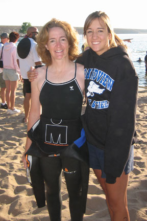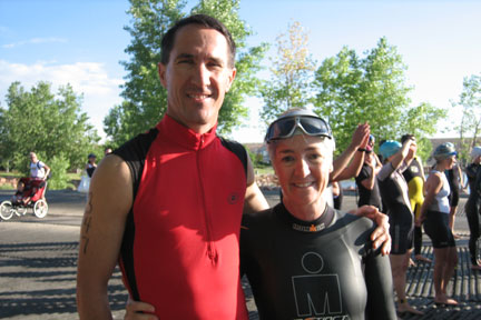 Walked from parking lot to transition - got my wetsuit on half way - which is a workout all by itself, and then headed down to the swim start to check out the swim course. Talked a little with Jen (numberswomen) and a lady from my tri class - I wasn't really nervous which surprised me a lot.