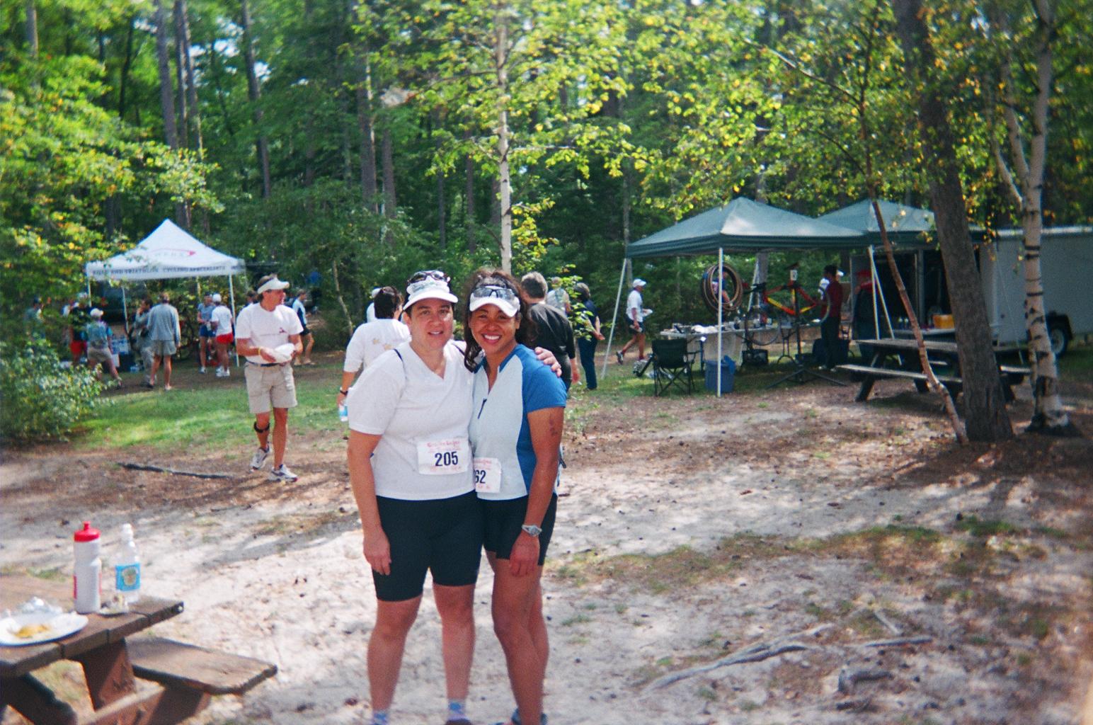 Warm down: Saw TriMom217 on run out-and-back and she told me about her bike fiasco. She looked great, in good spirits still, and I told her to hurry on back so we could CHOW DOWN! After running, I hurried to get my camera out of my bag, and cheered the rest of the athletes in...hopefully in enough time to catch TriMom217 go through the chute. What limited your ability to perform faster: UH....HILLS. :) Event comments: Endorfun and the race director Keith Jordan has put on the best races I've been to, which were 2 out of 5. Great post race feast, awards ceremony, raffle prizes (computrainer!), race venues, choice vendors, organization, volunteers, etc. I would highly recommend his races. We get good goodie bags too...this one had a drawstring backpack from Triathlon Bag . com. Last updated: 2004-09-26 12:00 AM