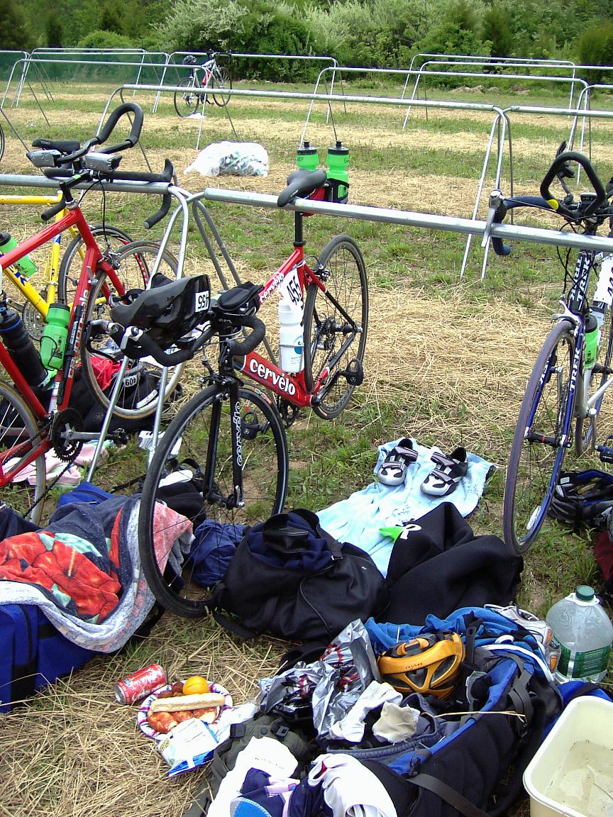 Woke up at 5, had a bagel w/ peanut butter, a banana, and a Cytomax pre-performance drink. Drove to race site, set up transition area.