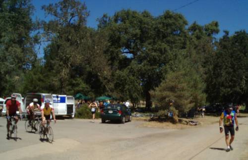 Comments: 7:45 am - Arrive at the race site. It is cold, and overcast. I am just really glad that brought my armwarmers as it is very chilly. Fill up sports drink bottle, sunscreen, pack 500+1 VIP items into my camelback and I am ready to go to registration. 7:50 am - Arrive at registration. I receive a wrist bracelet to identify me as a rider, but apparently am extremely challenged as I cannot get it on. Very Nice Reg Guy takes off the sticky thing, puts it on my wrist, and recommends coffee. 8:00-8:15 - Eat a lot of breakfast food. A Bagel, assorted fruit and other goodies. Tables full. I had a good time. At 8:30 I leave on the ride. My mantra for today is "You are on a TOUR! This is not a race!" I figure this is the only way to survive as I am doing this ride on what is, admittedly, not enough preparation. Everybody starts passing me. This becomes a common event. I, apparently, am the slowest bike rider on this ride. There are mountain bikes on this road ride, and yeah, they pass me too. However, the guy pulling a trailer WAS a little bit much. Time 0:45 - Feeling good I pull into the first rest stop at mile 10. So far everything feels ok, and I am going a little faster than I thought it would. It is still cool and overcast. Enjoy the homemade cookies, and grab some fig newtons. The road has been mostly flat till now, but we are now moving into the hills. Hit the first climb, just spin up it slowly while bikers roll by me like I'm standing still. Check my speed, and I'm going 4mph - I don't care, I am having fun. Make it to the top without having to stop and feeling pretty good. We are traveling by Lake Hennesey, and I stop and take a pic. (Pic 1) Next up is a section of rolling hills, which I'm going through about 16 mph. The uphills are short enough that I can just roll through them while using the downhills to pick up speed. Not so many people pass me on this section. Then we turn onto Pope Valley, which starts off flat, but then starts climbing. It's not too bad though, and I just stay seated and spin through it. Oh wait - that wasn't the top - now there's a whole nother hill. I stop and rest a couple of times, catch my breath, and take off my arm warmers as it's starting to get warm. People ask me if I'm ok - and yes I am. I pass a few people with flats, but I have paid off the bike karma gods with major flat issues in June, so I am flat free for the whole ride. Finally, hit the top of the Pope Valley climb and now comes the fun part. DOWNHILL!!! I hit 37 mph going down this road. It is very rough in spots, so getting shaken all around on the bike. A couple of faster girls pass me, get in front of me and then slow down - I'm going 30 mph at the moment, and sorry, but I'm taking all the free speed I can get. Either move it, or I'm going to breathe on your neck. They start picking it up a bit and I stick with them all the way down the rest of the hill. I'm enjoying the draft, and also pushing hard on the flats to keep up. When we finally get to the bottom, I can feel it in my quads - uh oh, maybe I had a little too much fun there. Stop at Pope Valley Grocercy and refill the sports drink. Now the road goes up and down, and I'm on my way to lunch. I'm feeling tired after pushing hard. Pass Ink Grade Road on the way to lunch. Time on ride 2:30 - Watch Time 12:00. Mile 32. I am half-way done. Hmmm... my GPS says I've only gone 24 miles. I think it lost me there on the screaming downhills. Decide I REALLY need a bike computer. Enjoy lunch with lots of salt on everything. Watermelon, sandwiches, boiled eggs, but the boiled potatoes were the best. (Pic 2 and the pic of me - gotta have at LEAST one of those.) I've never seen so many jerseys which are specific to various rides. I decide one day I'm doing the Horrible Hilly Two Hundred just to get the jersey which has a skull with red, glowing eyes prominently displayed. Of course the guy wearing it is uber-cyclist but what does that matter? Q: What is with the guys with the toothpaste mint green Bianchi bikes also having mint green jerseys and helmets? I noticed cause it was more than one guy/gal and that is one UGLY color. Note: Any road with the word "Grade" in it is going to be one Really Hard Climb. Ink Grade - 4 miles, straight up. This is where I essentially bite the dust on this ride. The first 1/2 of the climb goes ok. It is steep, but I'm managing it. I rest a couple of times, but can still get back on and ride. I walk a bit, but nothing major. I even pass someone. She is also not a svelte cyclist, and she passed me on the road quite a bit earlier (Note: Bianchi Rider) however, she is thinner than I am, so I feel pretty good as I move up the hill. Everyone is still blowing by me, only now they're saying "You're looking good" "Keep it up" "Good Job" - So, although I appreciate it, I know I am probably not looking so great. The GPS lost the signal somewhere on this hell hill - but luckily (or unluckily) the stopwatch is still working. About 3/4 (maybe?) I just can't keep going. It's too steep, and my legs are burnt. I start walking, but I ask how much farther. 1/2 a mile they say - this was a lie, but I don't know if they're just hopeful or if they really don't know. I see the SAG wagon pass (shoulda thrown myself in front of it - cause I could've really used a ride to the top) and notice the Bianchi bike is on the back. Well, anyway, I am getting there under my own power, even if it's on foot - so feel righteous for a while cause Bianchi girl didn't make it. Keep walking, walking, walking, walking. Drink water, walk, drink sports drink, walk. Get on bike, pedal for 100 yards, walk. Walk. Walk some more. After 1:26, I have finally made it to the end of Ink Grade, and hallelujah, there's a water stop. Refill everything, the volunteer soaks me with the hose (yeah, I asked her to) and I'm ready for the downhill. After a few ups and downs, the road starts heading down. This is the major downhill. We turn onto Deer Park Road. The pavement