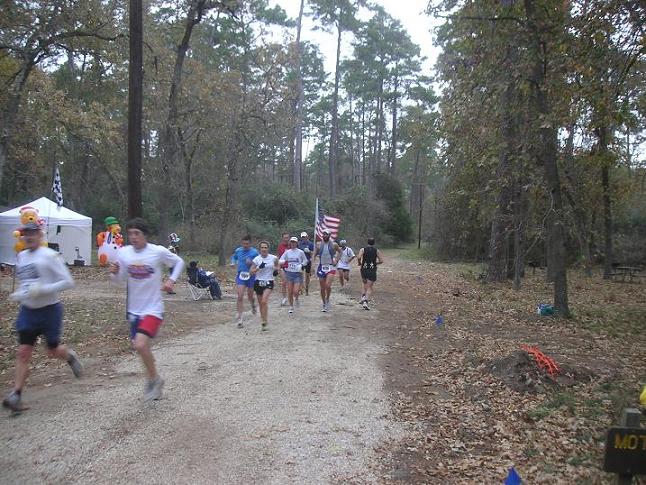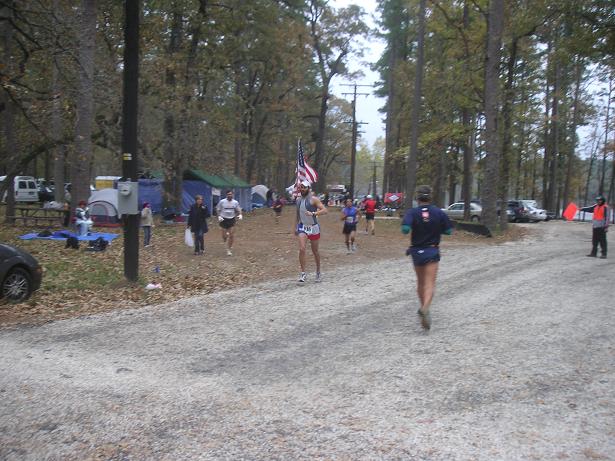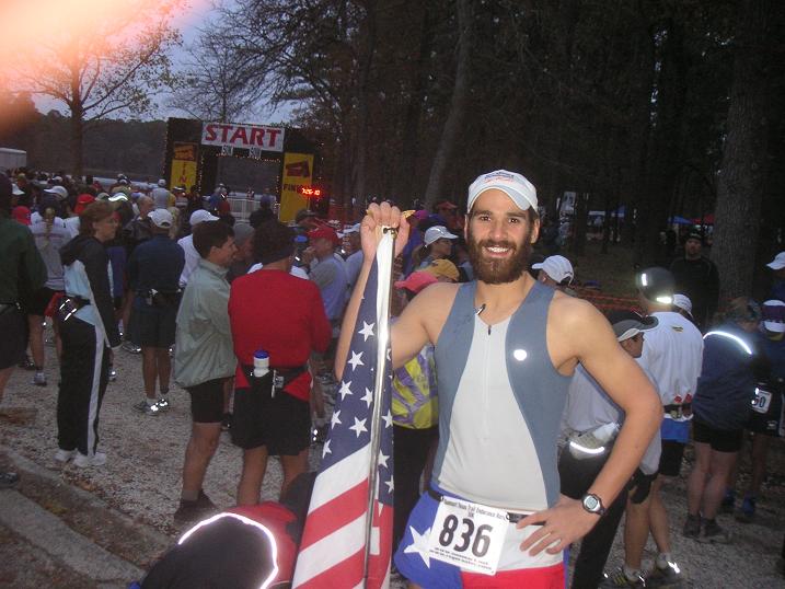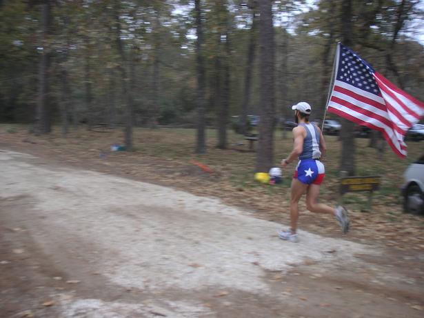 Comments: The first mile or so was on the only road leading into the park before we turned off and got on the actual trail. As luck would have it Gina found me just before we hit the trail. When we couldn't find her before the start I started to get worried that she wasn't going to make the race, so it was a big relief to find her early on and see that she looked ready. This was my first ever trail race and as soon as we got off the pavement I was in love! It was just such a gorgeous place to run! Plus I had to constanly look out to avoid rocks and roots and tree branches. SO MUCH FUN! The first loop was a short out and back section that was just over six miles in total. The trial was narrow and you didn't have many chances to pass people so I had to take advantage when I could. 20 minutes in I saw the race leaders coming back down the trail. I hit the turn around in a little over 25 minutes and headed back to the start. It was interesting to see the people still coming down the trail as I ran the opposite direction. People were grouped off into packs. You'd see runners in groups of 3 or 4 or even a dozen of two in the middle of the field. It made me think of this as more like a cycling race than a foot race. So that's how I looked at it. I'd pick up a faster runner as my mark and chase him. Every few minutes I'd come to a group of slightly slower runners and join them to give myself a break and keep my HR in check. After a few minutes I'd drop them for a faster runner until I hit the next small group. By the time I got near the end of the initial small loop and started seeing the race leaders again, I started to realize that I was at the back of the front of the pack! What a rush! I came to the turn around running 8:00 miles and feeling great. Haley and Welshy were waiting there and snapping photos like crazy. It felt really good to hear someone cheering suddenly. Trail runs can be very quiet and very lonely. Started the first of two 12.5 mile loops knowing that I was somewhere around 40th place. Crossed the road and hit a really fun section of trail. Just a single track with trees lining either side. It was like running down a small winding tunnel. It really made you feel like you were running fast and I'm sure that just made me run even faster. I had decided to run this race in my normal race shoes instead of my trail shoes. Sunmart is a fairly tame by trail race standards and I thought it would be good to wear a familiar pair of shoes for my first ultra. Well, the disadvantage to that is that my trial shoes have an extra lug on the side of the ankle to keep your foot from rolling. In the first hour there were 5 instances where I nearly rolled my ankle. I could have very easily injured myself but was lucky enough to take the weight off my foot before I hurt myself each time. Definitely wearing trail shoes next time. Got to the out-and-back section of the big loop and had my first long hill climb of the day. The trail was all sand and dirt here so I tried to stay on the harder packed dirt and just keep my turnover going. Made it to the aid station at the turn around (about 9.5 miles in) and I still felt good. Seeing that the middle of the pack was just getting to this section gave me a boost as I went into the long stretch where the 50K and 50 mile split. People were really starting to spread out now. I had been jumping from pack to pack up until now but I could tell that was over for the day. The next person was well ahead of me and it was just each person by themselves now. We headed up a long hilly section for several miles before we hit the next aid station. From here it was more than 3 miles to the next station; the longest stretch in the race. We turned back into the woods and kept climbing hill after root covered hill. It was something new to have to constantly look down as I ran. I didn't have much of a chance to look down the trail and see how much was ahead of me and I think that helped keep me in the heat of the moment. As the trial got tighter and tighter I had to carry my flag lower to keep it from constantly catching on branches. Eventually I got into a good rhythm with it where I could actually swing both arms for a change. However, I could already feel the chaffing in my left armpit and I knew how much that was going to hurt by the end of the day. After what seemed like an eternity we came to a wood bridge as we crossed the marshy-swam area of the park. From there it was a short mile to the last aid station before we finished the loop. I made it back to the start line (18.6 miles) in about 2:40! If I could keep it up for the last 12.5 miles then I'd easily break 5 hours! Much better than I thought I'd do. Only problem was that I was finally bonking. Coming into the turnaround there was no one cheering. It had started cold and never warmed up. People were in their tents with their space heaters trying to stay warm and on top of things it was starting to drizzle. Haley and Welshy had already left for Dallas to pick-up their packets for the White Rock half tommorow. So after spending the last hour and a half all by myself I started the last loop just as lonely but now I was getting cold and exhaustion was starting to hit. Running over the same section of trail twice now really showed me just how much I had slowed down. The trees weren't flying past anymore, I was just barely holding onto a jog by now. I made it to the out-and-back again and really took my time at the aid station. Had some Dr. Pepper, Fig Newtons, M&Ms and a chunk of baked potato rolled in salt. This section was my least favorite the first time so I knew it would be a killer this time around. I knew right from the beginning that I'd have to walk the hills. So I powerwalked along my way and started seeing people from the 50-miler as well as 50K walkers who I was now lapping. I hoped that I would see Andrew along the way and get to find out how his day was going. No such luck. I hit the turn around, grabbed m