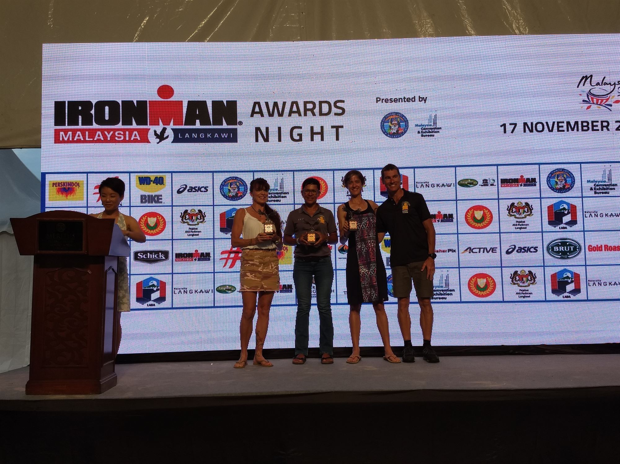 Warm down: Uh....none. Unless you count talking with Craig Alexander at the finish. The "catchers" made you sit down while they took off your timing chip and then chatted you up to make sure you were okay. My legs really cramped from sitting. They wanted us to sit longer, but I insisted I would be okay if I could just get up out of the chair. Which I was. I just refused to sit anymore, apologized and got up and walked away to the food. They had a lot of food but most of it looked disgusting. Passed up the spaghetti with meat sauce and potatoes au gratin. Had three bowls of pumpkin soup (really!) and a couple of Thai coconut custards. That was enough. Collected my swag, failed to find Mom (she was at the finish, but went back to the room when I didn't materialize quickly at the exit) and stumbled my way in the dark back to our bungalow. I swear that was harder than the last two km of the race! What limited your ability to perform faster: *Mainly inexperience at this distance. I think I finished with too much in the tank. I simply didn't know what I was capable of, and was probably a bit too cautious. Should have pushed the run harder once I started feeling better. But my first priority was to finish, and out of the med tent, which I did. I would rather be third than DNF or end up in the med tent for my first IM. So I am good with the result for now! *Bike course difficulty, the storm, rough road conditions, and heat/humidity. But it was like that for everyone. All bike splits were slow--many other athletes said 40-45 minutes off splits on faster courses. I know I can do the distance close to 6 flat in training. *Bike issues--I couldn't always use the best gearing for my body and the course and that probably contributed to cramping and sub-optimal pacing on the bike. Also wasted time due to things falling off bike. Having some data (cadence, power, speed) would have probably helped me manage effort on the bike better. Event comments: I originally chose Malaysia for my first full IM when I was still living in Vietnam early this year. A good friend (actually, the only other competitive female triathlete in Vietnam) had done it, it was an easy trip (two 90-minute flights) on budget airlines, I wouldn't have to worry about a cold swim or cold weather, which I really dislike, and I would be well acclimated to the heat, living and training in Saigon. Despite the obvious inconvenience, I decided to stick with my decision, even after I knew I'd be moving back to the US at the end of the school year after my dad passed away. Just couldn't get enthused about the available late-season alternatives in North America. In the end, I'm glad I stuck with my original plan--it seems like all those races ended up having issues with bad weather, cold water, swim cancellations, and/or location changes. It's a stunning course. The swim is beautiful, calm, and well-organized in a sheltered bay. I detest cold water and felt that the temps (low 80's) were almost perfect. Some complained that it was too warm--as in most tropical ocean swims, there were a few stretches of water that felt warmer than others, in this case almost uncomfortably so even for me. Someone who's sensitive to that might want to consider the bikini or speedo and speed suit route, rather than a trisuit on the swim, to stay a bit cooler. The bike course is slow and brutal--very rough road surfaces in many areas, many steep, though relatively short hills, a possibility for severe, even dangerous weather en route, little traffic control in many stretches..... The course never disappoints or bores, but be prepared with bomb-proof tires and tubes. (I rode Gatorskins with sealant--watt savings be dammed, I didn't want a flat. I'd guess at least 10-20% of participants flatted.) Nutrition, hydration, Garmins, etc. need to be NAILED to your bike or person. I was actually keeping stuff in my bra after a while! Whatever could fall off the bike, did, with the exception of my person. The roads were littered with fallen bottles, nutrition, bike parts, etc. Quite possibly this bike course could win a Most Interesting Roadkill competition--I rode past (hopefully not over!) the remains of monkeys, monitor lizards (the size of small dogs) and a cobra. Roadside monkeys were having a field day with fallen water bottles, gu packets, and bars. (No, I wasn't hallucinating.) Kids, dogs, etc. occasionally wander on the course. You have to be alert at all times. In some ways that could be bad/stressful; on the other hand, I think it helps keep you mentally engaged and notice fatigue less! I would avoid expensive wheels or automatic shifting on this course--the fancier the bike, the more breakdowns I saw. There were athletes who had to withdraw due to cracked frames and broken wheels. (Not tires, wheels!) The run is "easy", except for the heat and the fact that it's the last leg! 2 1/2 laps and totally flat, with aid stations every 1 to 1.5 miles. You go through the Convention Center, which has an aid station, Special Needs, and AC, for T2, then again at 10 1/2 and 21 miles. The only drawbacks are a near complete lack of shade before sunset, and that some sections after sunset are REALLY, REALLY dark, out in the country between villages. (My friend had said the airport perimeter lights would be on, but they were not.) I would suggest a headlamp. Few athletes had them, but I think I could have run a bit faster and more confidently if I'd had mine. In general, the event was very well-organized with some minor glitches. T1, T2, and finish are in separate locations. T1 is about 45 minutes by bus from the finish and race HQ hotel. The "shuttles" are normal tourist buses, and it was really interesting with everyone trying to load bikes into the seating area. Might be better to organize a private taxi, but there were long waits (an hour or more) for both taxis and shuttles on Friday. I think organizers need think this through a bit more, given the numbers of people and time limi