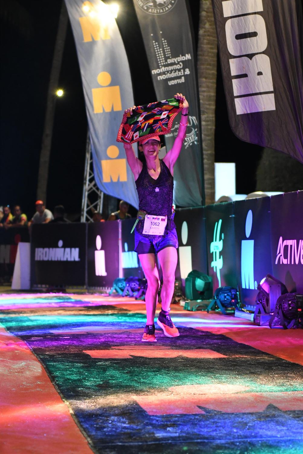 Comments: I wasn't feeling great on the first lap (kind of nauseous and woozy, tight back and glutes) so I did not push the pace, walked part of all the aid stations, and did a little extra walking at ten minute intervals (maybe 30 seconds) to try to cool down a bit. Once the sun got lower and particularly after dark, I felt a lot better and tried to pick up the pace.I still walked part of the aid stations as per my coach's advice, but didn't really feel it was necessary anymore. Mainly did it so I could eat pretzels, which were helping me tolerate the sweet stuff (electrolyte and gu). Otherwise I think I would have had nausea/GI issues with them--I certainly have in shorter events. I really just kept feeling better and better throughout the run. Except for some glute tightness and intermittent minor calf and shin cramps, no real issues with anything. My guts were fine and I felt like I could keep going for hours at a steady pace, if not as fast as I'd hoped. It was NOT what I expected at all. Even in the last few kilometers, while I didn't feel particularly fresh, I didn't feel totally exhausted. I don't think one is supposed to feel that good at the end of an IM! Anyway I made it to the finish in good form, high-fived some kids and shook hands with my mom. Then I waved my "flag", a bandana with the flags of about 20 countries on it, including the US, Vietnam, and Malaysia. I chose it for the photo, because I am an international person! Someone told me in an Australian accent that I was an Ironman and put a medal around my neck. Then I got hugged by Craig Alexander. (I had asked him a stupid newbie question the day before and he was really nice to answer it. He recognized me at the finish!) Honestly, the finish itself (except for Crowie) seemed kind of anti-climactic--the race experience itself was much more amazing, and once I started the run, I never had any doubt I would finish! What would you do differently?: Not sure. I think I could have pushed the middle and latter parts of the run harder. I kept expecting the wheels to come off dramatically and they never did. Chalk it up to inexperience--I really didn't know what to expect or what I am capable of at this distance. I was also more cautious than usual owing to the heat/humidity and not being as acclimated to them as when living in Vietnam. I think that also owing to all the bike drama, and inexperience, I exited the bike fresher than I otherwise would have (if I had had proper gearing and a PM and was pushing a more aggressive pace). Had I pushed the run harder, it probably would not have been enough to get me into first place AG and KQ (38 minutes back of that) without a much stronger bike leg that is probably beyond me right now, but maybe could have given second a run for her money. ![]() Post race
