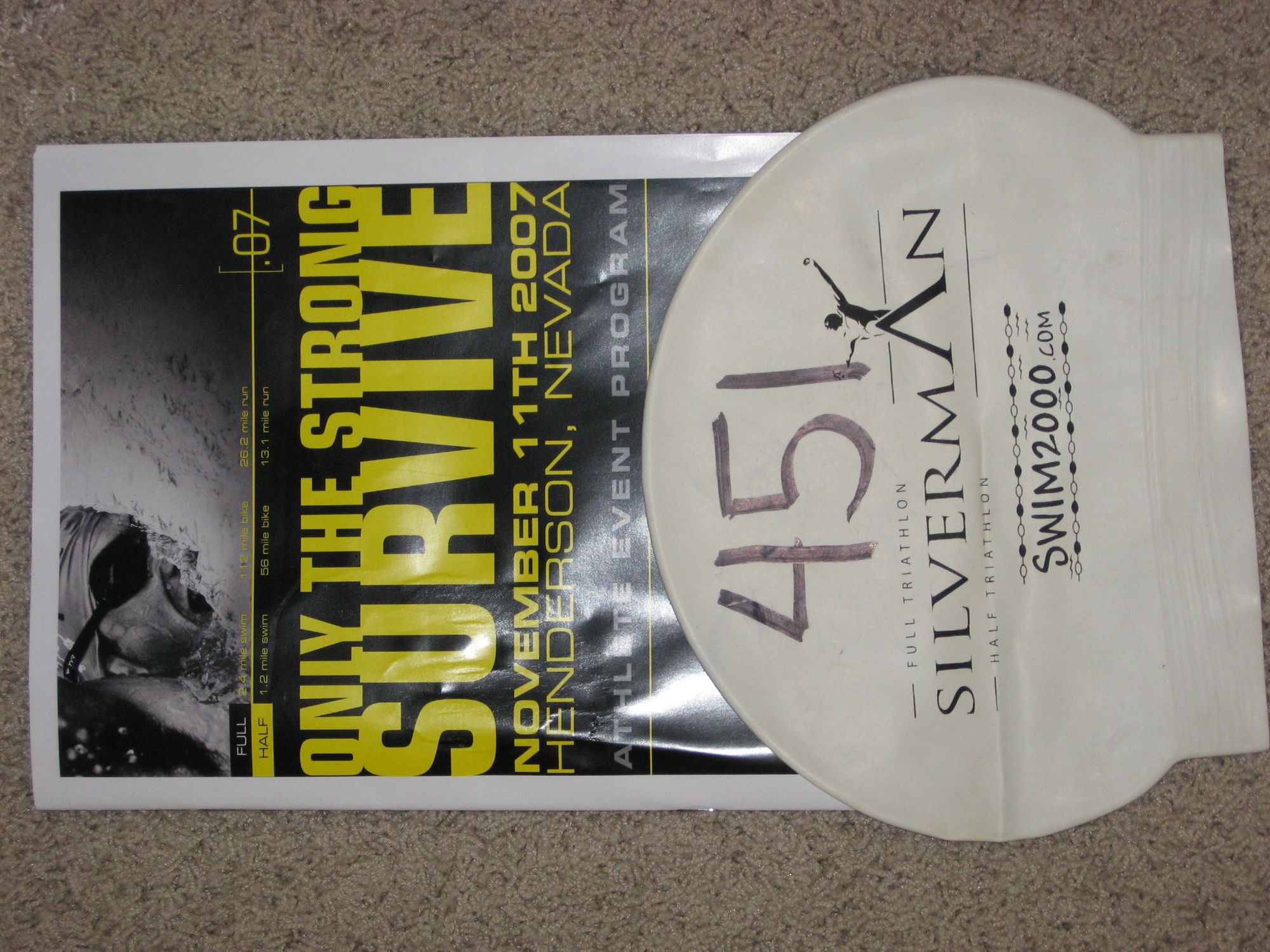 Warm down: Just walked around, grabbed some food and a space blanket to keep warm. Event comments: This race is top notch. I don't think it could have gone any smoother. The volunteers were great. Tons of stuff on the bike and run course. On the run, someone would meet you ahead of the station to ask what you wanted, then they would yell that out, so you wouldn't have to scramble to get what you needed. The schwag was awesome, a felt blanket, water bottles, nice transition bag, visor, t-shirt and other goodies. Age group winners also received a free round trip ticket on Allegiant Air to/from Vegas, along with a plaque and gift certificate to Tri-sports.com. I would highly, highly recommend this race to everyone. One last story. So if anyone was at the banquet, you know we were treated to a talk from Dave Scott on his race. He commented on how Macca couldn't pass the "Old Man" on the swim and just drafted instead up until the last possible second before racing out of the water to get the swim premium. So Dave Scott threw Macca his swim cap. He also talked about how he didn't know how he was given the number 451, as he always had number 1 or number 2 or so other low number. But not 451. It was a little joke that got the crowd laughing. So after the banquet, Macca comes over to our table to sign some stuff for Julia and to talk to AJ. Long story short, Macca wasn't too thrilled to have Dave Scott's swim cap, so he gave it to me. So if anyone is interested in putting a bid for it, I'll listen to offers..... Fantastic race Last updated: 2007-01-08 12:00 AM