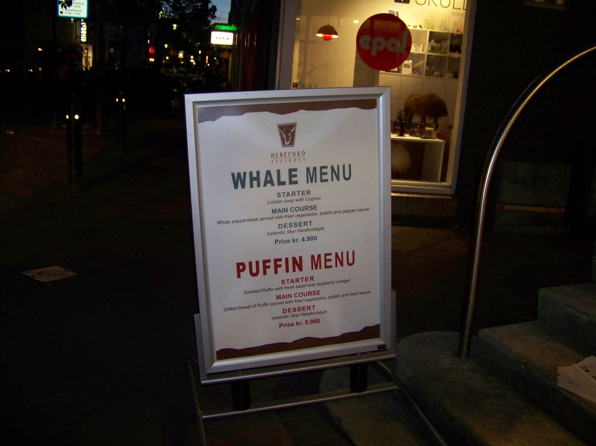 Originally posted by mdg2003 Awesome pics! Whale and puffin menu at a steakhouse? Just how scarce and pricey is beef around there? I'm not a big fan of lamb, which from what I've read is their main protein other than fish. I need my weekly steak!! Is chicken readily available?