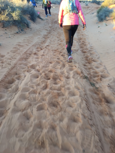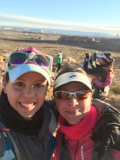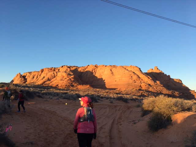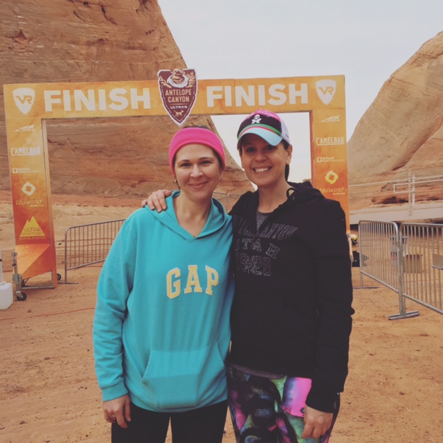 Comments: The gun went off and I thought, here we go! No stopping for 34 miles! I just had no idea what to expect except for sand of course. Everything I read was sand sand sand - and the first couple of miles were definitely in fairly deep sand. Amber and I decided early on there was no point in exerting crazy energy trying to climb up hill in the deep sand, and everyone else seemed to agree and walk those sections. After we reached the top of the first climb everyone was stopping to take photos so we did, too. THEN MY PHONE DIED. Two miles in. I was kind of heartbroken, knowing that I wouldn't get photos of the most beautiful place I'd likely ever run in. But no use dwelling on it. Nothing I could do. After that, we ran on a few miles of sand (I think, it's all running together), then crossed several miles of solid, jagged rock. It was not very "runnable," and we were just power climbing and trying to jog a few steps here and there where we could. There was no path on much of this section, it was just - find your own way in between the rocks and the spiky bushes and try to find the next pink ribbon marker. Up, Up, Up. For many miles. I was wondering when we would get to go down. Then we started to descend into the canyon. Here was the down. Parts of it made me very tentative but they were doable, watching Amber ahead of me. But there was one section where I was truly a little scared. I couldn't see a good way to get down (I think Amber had slid on her butt) and my knees and ankles were not happy as it was - sliding or jumping in this terrain was not in my wheelhouse. Amber had to coax me from the front, while another lady had to coax me from the back. I knew I would make it down, but it was just very scary for a minute. More descent and finally we were on the slot canyon floor. This was it - the most stunning part of the course and I knew it would be. The canyon walls twisted and wound around, smooth and beautiful patterns, yet jagged pieces jutting out so far you had to bob and weave as to not knock your head on the rocks. The sunlight streamed down here and there and I was in awe of the universe here. It was, like the Navajo elder had promised the day before, a very spiritual experience and one that I will never forget. There was a 10-foot or so ladder we had to climb to begin the exit of the canyon and I was proud that handled that surprisingly well. Not the ladder itself but getting off of the ladder and through a very tiny, windy, cave-like hole where you had to crouch and twist and lift your legs in different directions all at the same time. After the canyon, it's kind of a blank space in my mind. I think we covered mostly sand after this, trying again to run what we could and walk/climb the rest. I just can't remember though, but I know that was the end of the first loop. The volunteer told us there that we were 40 minutes ahead of the cut offs, which was OK but not as much of a cushion as we wanted.We had one more, separate loop to go and it was supposed to be the most runnable - I was really looking forward to that even though I had blisters forming and my quads were utterly busted from the ups and downs.The other thing that was concerning me was that my fingers and wrists were swelling to an alarming degree. I couldn't make a tight fist and they were so fat like sausages. I kept lifting them above my heart for long sections of time, but nothing seemed to help. They didn't hurt, but it worried me a lot. Inside the 2nd loop, I was mildly disappointed that people considered this "runnable." It certainly wasn't the rock/mountain climbing we had on the first section, but the jagged rocks and terrain made a trail rookie like me slow to a walk, otherwise I knew I would trip and go down. I just tried to stay a few paces behind Amber and put my feet where she was putting hers. After the first few miles of this, the ground did turn more runnable, in a single skinny track. We ran big sections of this and walked the uphills. I felt like we got in a pretty good groove where we could here, despite being 22 or 25 miles into this thing. At the far aid station on this loop we were only 25 minutes ahead of the cut off but that was the last aid station with a time cut off so we knew we had made it. I really slowed down on the back half of this loop, I had blisters forming and popping on both of my feet and everything hurt. Amber would prompt me to run by just starting without saying a word, and I would comply for the most part. One time I let out a loud groan and she laughed but didn't push me to run. This section seemed to be in slow motion since we were walking so much of it and we were so close to the end, yet so far away at the same time. Finally we sighted the last aid station that is a mile from the finish line. I had to pee really bad (SUCH a good thing, I was very on top of hydration) so stopped to do that and grab some M&Ms, then we had to shimmy down some more rock where I got kisses from a trail doggie that just made my day - then onto the last 1/2 mile of deep sand and then we were all the way down and just had to run around the amphitheater. We made our way to the back entrance where a ramp was set up and as soon as we rounded the corner of the ramp I saw the finish signs and heard the Navajo drums playing over a speaker and the announcer. I squealed like a little kid and gave us a drum roll on Amber's back - here we are! Freaking finishing a really difficult 55K! I was so surprised to see a lot of people at the finish line, cheering with kazoos and hollering for strangers like us. People were clapping and looking us right in the eye with this genuine happiness for us. It was amazing. What would you do differently?: Physically: I was REALLY pleased with my training. The best I could train was on a gravel path and I think that really prepared me for the sand and sliding around. I'm not sure how I could have trained for the mountain climbing, except maybe a stair climber. Mentally: A