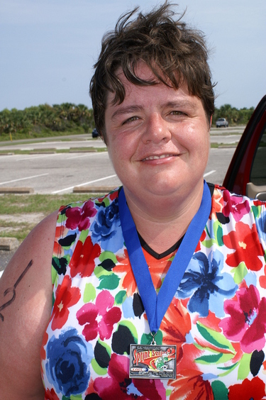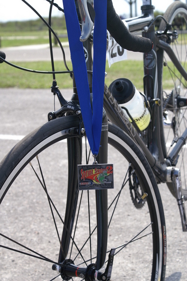 Comments: This was awful! I started with a spasm in my lower back just out of transition and it only got worse. I turned into a long, slow, death march in the scortching heat...on asphalt. There was every reason to quit. I just kept stopping and stretching out my back. My heart rate was up a little but my legs felt good, like I could jog a little but there was no way my back would let me. I got slower and slower and it just got hotter! The other Athena was only about 2 minutes ahead of me at the turnaround and I know I could have caught her if I had not been having that horrible spasm in my back!! Since I was last, this race volunteer decided that he would follow me on his mountain bike...the entire run. He was the teenage son of a couple that worked with the timing. He was mentally challenged. He stayed on my heels the entire time, talking constantly! Oh my!! Everytime I stopped to stretch or slow down, or did anything he would say "Are you okay? Do you need an ambulance? I have a walkie talkie, so I can call someone!" He was excited to use the walkie talkie and wanted me to want some help. He was nice, but it was HOT and i was hurting...I just wanted him to go away!! With about 1/2 mile to go, my friend Jim walked out to walk me in. Thank Goodness!! I thought I was going to start screaming at the kid!! When I finished, I sat down right after the clock so I could stretch my back out. The RD came up and talked to me for a minute. What a super nice guy!! I told him what a nice race he puts on and the he started slowly pouring cold water down my head and back! That's a good RD!! It turns out I came in second and the RD had hung my hardware on my bike! How cool is that to come back to transition, yours is the only bike left and almost all of the racks are gone, and there is your beautiful bike with hardware on it!! ![]() Post race