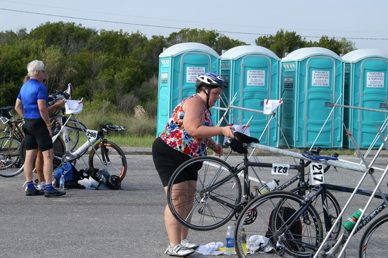Comments: This is the part that I was really stressing over. I have had some serious anxiety about getting accustomed to my bike on the road. This would be the longest outdoor ride that I have done. I have had little to no practice at drinking on my bike and I was stressing about that also. I was suprised at how well I did!! I did pretty well at drinking after I dropped my first bottle, ran over it, and almost crashed!! LOL After that, I did pretty well!! On the way back in I was doing 16 to 17 mph, which is fast for me and I was happy with that. Overall, I felt really good about the bike. I slowed and asked someone if they needed help. It turned out it was the Athena that should have won the race, the one I met at Disney. She ended up DNF due to bike problems. On the straights I could see the other Athena ahead of me but I was afraid to push it too hard with so little training under my belt these days. What would you do differently?: Train, lose weight, ride out on the road more. ![]() Transition 2