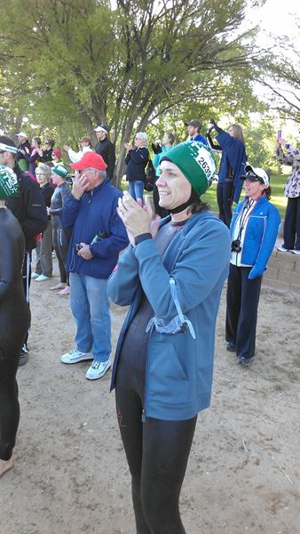 The guy next to me in transition, Jim, was also from ABQ and had also done O'side this year! So we had lots to chat about. His life partner stood with my DH on the other side of the fence (my spot was next to the fence) and we all chatted about the drive up to GJ and races in ABQ. We'll be looking for Jim and Johnny at races in ABQ! Jim forgot his wet suit and the water was about 62*. Fortunately someone had a spare! (who carries a spare wetsuit?) Jim was able to squeeze in to it before transition closed.