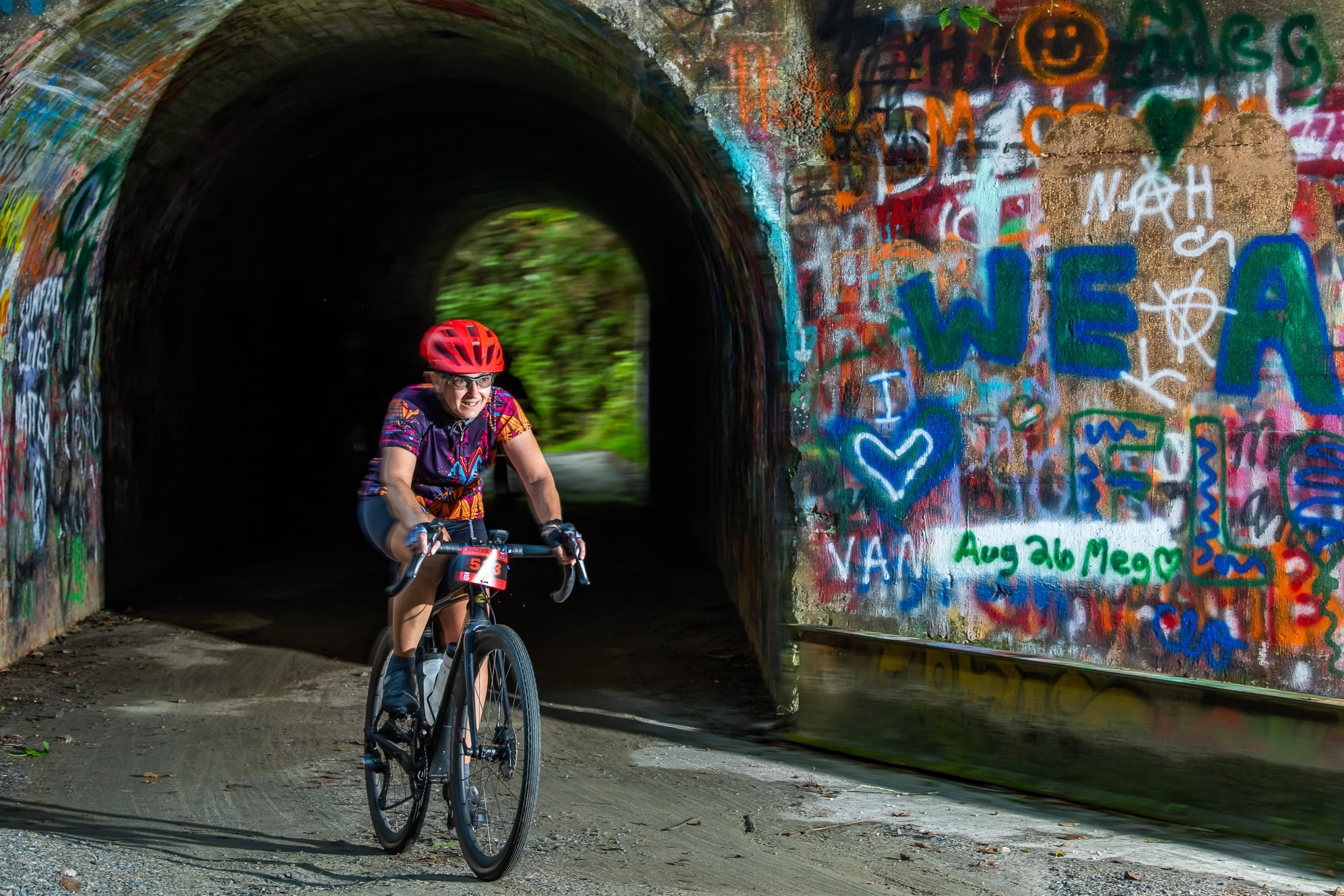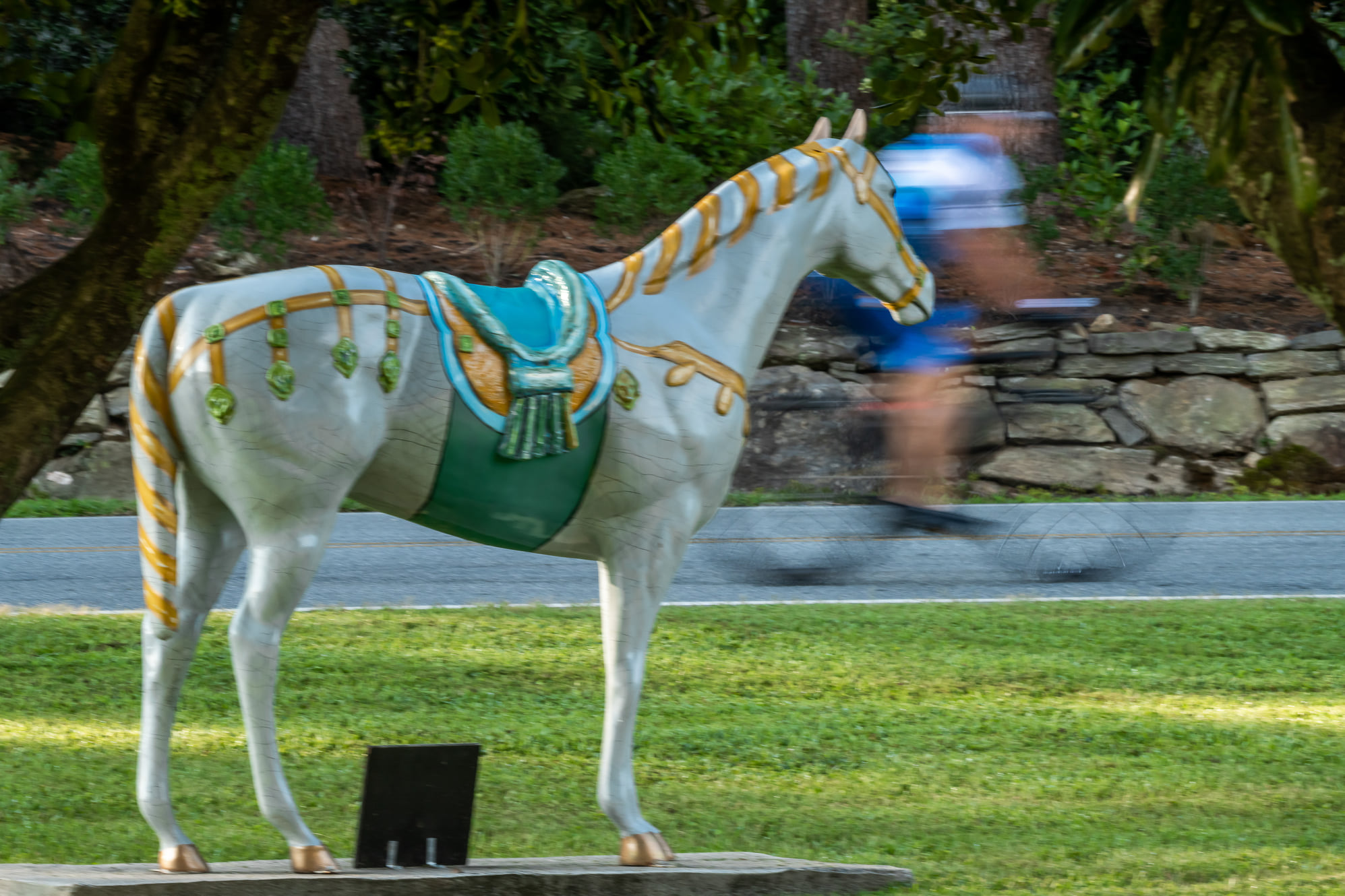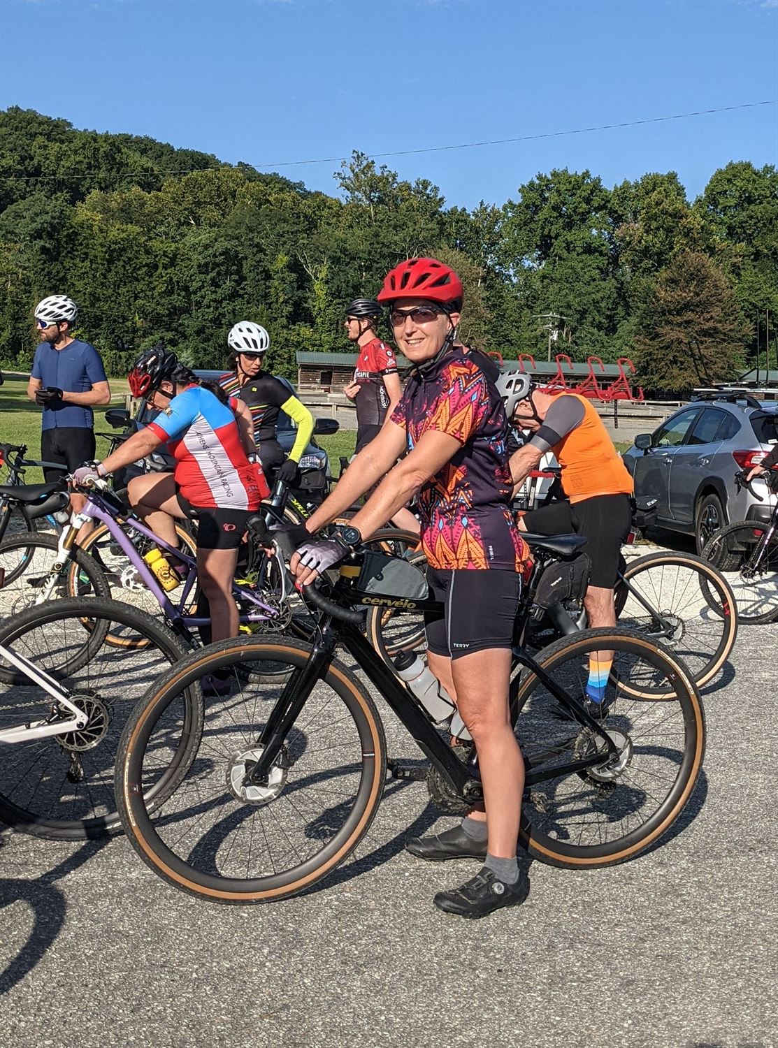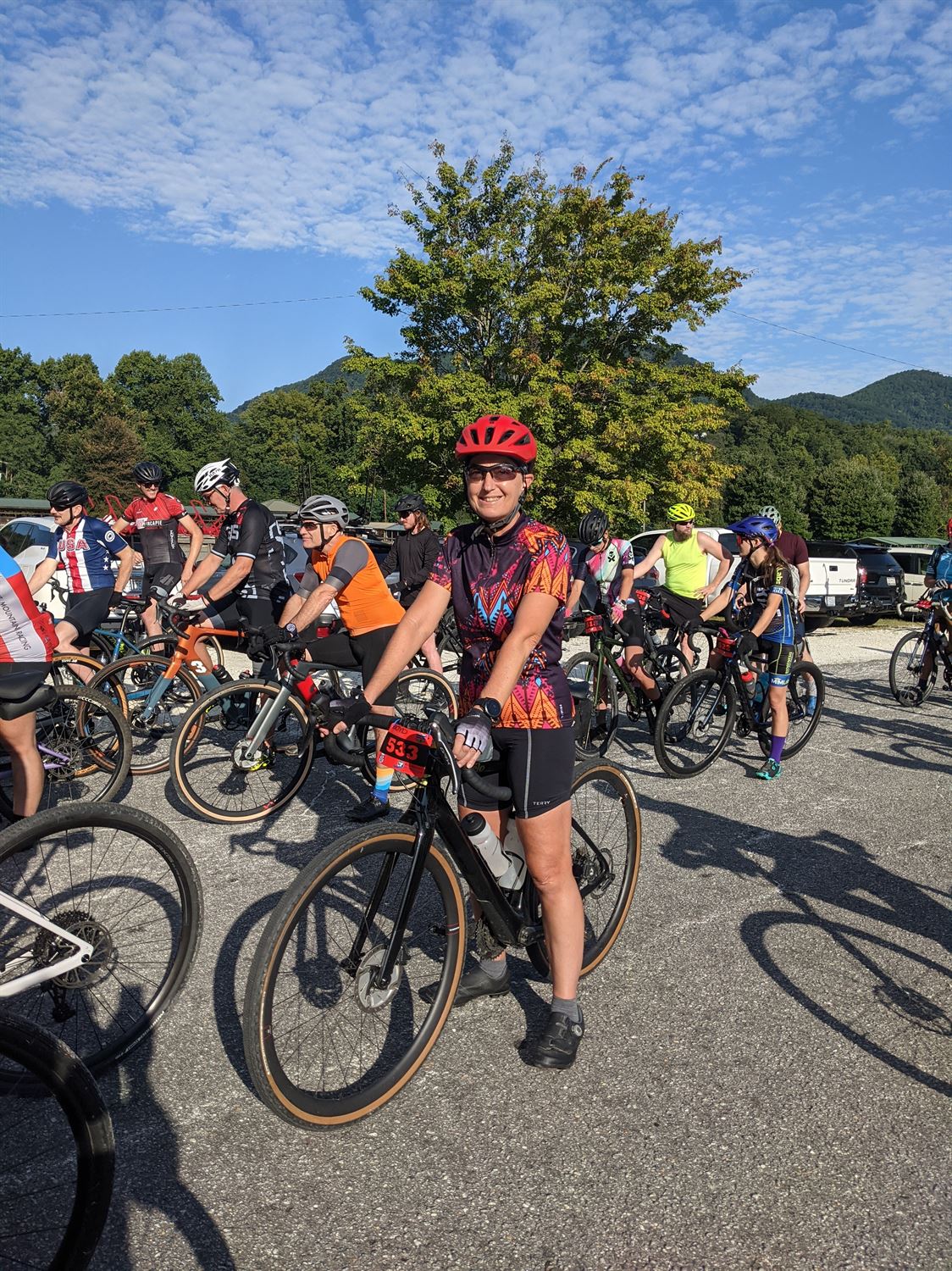 Set the alarm for 5:45. Got up and walked the dog. Then had breakfast -- a bagel with peanut butter, a banana, and coffee. We left for Tryon a bit before 7:10 and arrived at 7:45. There was plenty of parking. Went to packet pickup and was back to the car within five minutes. I got my race number and fixed it to the front of my bike and observed the gravel bikes around me. There was a nice, relaxed vibe with music and an announcer.