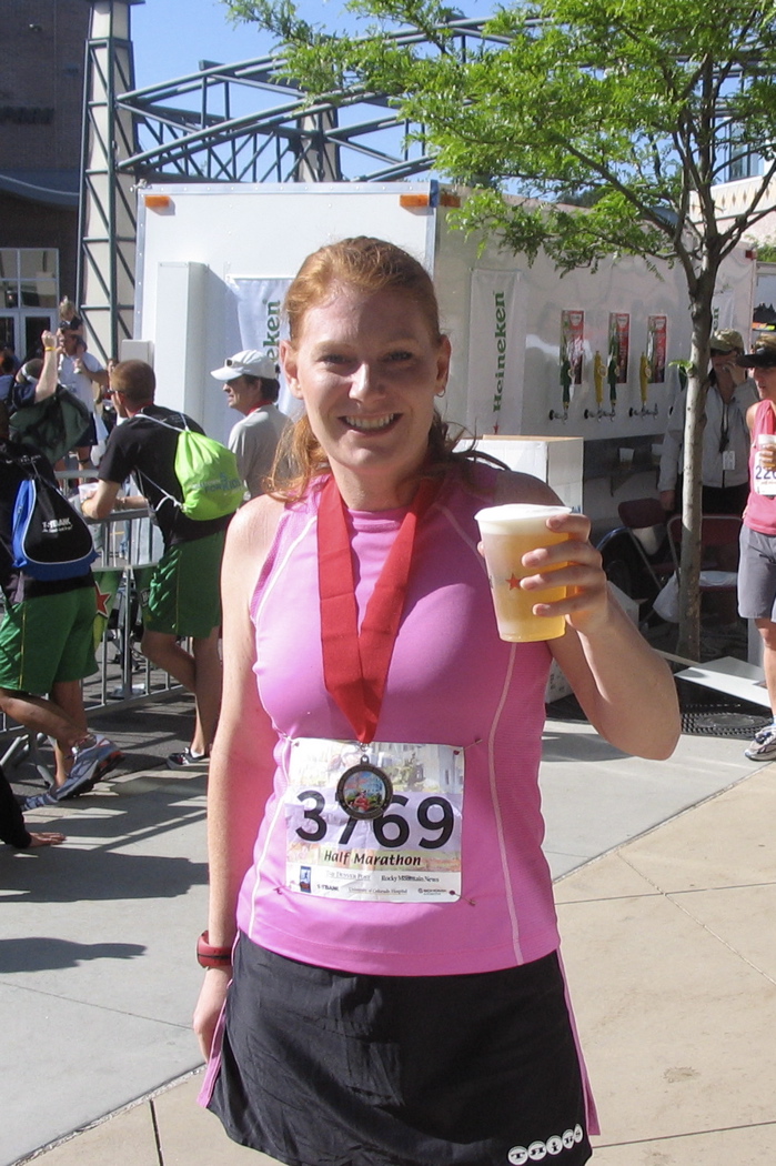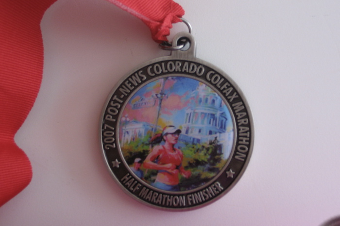 Comments: I just moved to Denver a week and a half ago so I had no delusions of being acclimated. My plan was to do the Penguin's run/walk and do a 4 min run with 1 min walk break and hope to do around 2:45 overall. I was able to maintain this ratio most of the race, except for a few times when I only walked 30 seconds. I really fell into a nice rhythm after mile 2 and didn't feel as out of breath as I did starting which seems to be how I feel running up here. My body felt good but I had a twinge in my knee at mile 8 that had me worried given my IT band issues that had me cancel the St Louis half, but it went away and I felt great. I kept waiting for agonizing pain to set in somewhere, but it never did!! The last half mile was really the only hard part where I was really having to push to keep moving up that incline to the finish - I don't know what my HR was but I was panting that's for sure!! My other grumble is my damn bladder!! I only had about 16 oz before I left the house, and I went before I started, but yet still at mile 2 I was starting to feel the urge. I wonder how fast I could be at long distances without horrible potty lines!! I lost almost 5 minutes at my first pee stop due to a long line but luckily as the race went on, there were more frequent portapottie locations with no line at all so I could just duck in and out. With about 4 miles to go, I realized that I was way ahead of where I thought I would be and I knew I was looking at a PR unless something went horribly wrong. I still kept with my run/walk ratio and it served me well. I found myself passing a lot of people the last three miles who had run past me early on and I still felt good. Looking at my splits, I was pretty consistent the last half and interestingly enough, my last mile was my 2nd fastest!! All in all, I'm thrilled with my performance and thought it was a pretty fun race. Mile splits 1= 11:55, 2=11:27, 3=11:56, 4=12:02, 5=17:05 (damn pee line!), 6=10:39 (ran the whole mile to make up time), 7=11:46, 8=11:55, 9=11:40, 10=11:48, 11=11:44, 12=11:45, 13=11:05 I should mention that the volunteers at the hydration stations we so enthusiastic and though there weren't a ton of spectators along the course, the ones who were there were quite enthusiastic as well. What would you do differently?: Nothing really - I hadn't trained as consistently as I would have liked the prior two weeks, but I'll consider it an extended taper :) I don't think I drank too much by any means, I think I need to accept that my bladder gets nervous during races and I'm going to lose time. Maybe that will spur me to get faster :)  Post race Warm down: I grabbed a few Panera bagels (yum!) then headed to the beer cart for my free Heineken!! I stretched a little and iced my knee when I got home. Event comments: I thought this would be horribly boring - the idea of a point to point race that was just along one road - but I actually liked it. It was interesting seeing the diversity of the communities along Colfax Avenue (there were even the occasional homeless looking sort watching the race with a smile on their face, cheering the runners) and the spirit of the volunteers along the way was quite infectious. The weather was perfect, though as the sun came up I was glad I was finishing my race because there's hardly any shade along the way ... I was guessing the full marathoners were really having a hot, bright last half of their race. Other than the lack of portapotties at the half- start, it seemed pretty well organized with enough hydration stops along the way. I also thought the medal was pretty which is always a plus in my book :) Last updated: 2007-05-13  12:00 AM |